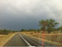 We travelled in 42 degree heat towards Halls Creek. As we left Kununurra so late, we knew we would have a long haul and be pulling in around dinner time. It was late in the day when we noticed the sky darkening. We saw lightning in the distance and the sky kept getting darker. The temperature dropped from 42 degrees to 25 degrees in 20 minutes. For the first time in a long time we wound down the windows and felt the wind in our hair. Not long after, the temperature rose sharply again to the high 30s.