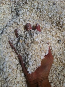 of shells. Makes walking without your thongs slightly painful but really amazing to look at. The town of Denham has a couple of historical buildings that these shells have been used to make bricks out of. When we took an evening stroll around the town we noticed these shells used in numerous places where we might use Lilydale toppings or chip bark back in Melbourne. Ray even found some shells mixed in with the concrete holding a parking bollard in place.