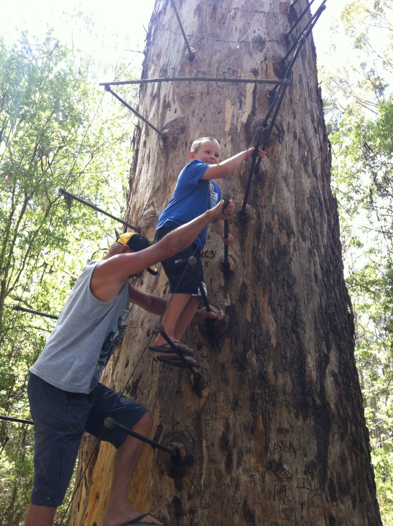 This area of Australia is home to great forests and it was actually very serene driving through the winding countryside. At Pemberton we made our way to the National Park which houses the Glouchester Tree. This tree was used as a lookout to signal bushfire warnings and is now maintained as a challenge to anyone who feels like climbing the 61 meters up and around its girth. The steps which you take this challenge on are are metal pegs dug deep into the side of the tree and a flimsy wire surround gives some semblance of security. Caleb was eager to climb so we let him go as far up as he could. After 22 pegs, he reported that his legs were wobbling and he returned to the ground. We were glad he had a go. There were other people there, grown men included who didn’t get much further up than Caleb and had to retreat. Very challenging!