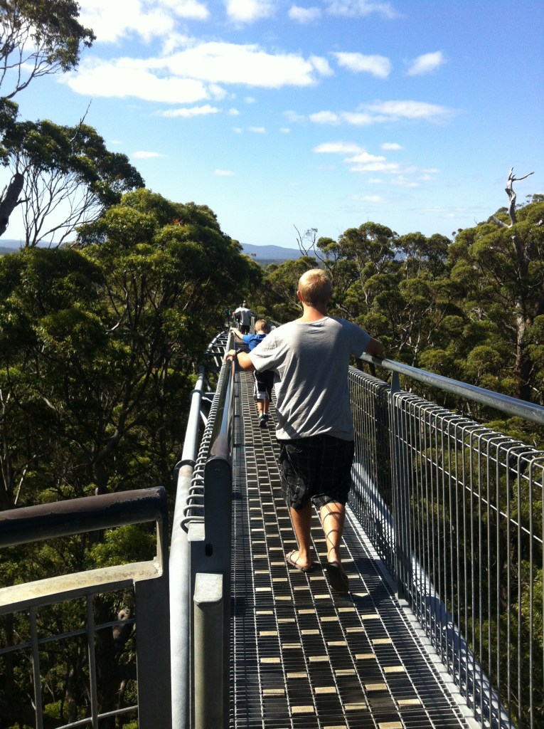 We decided to head for Walpole and the “Valley of The Giants”. This area is home to the massive Karri trees which are hundreds of years old. There is a Treetop Walk that you can do which we had seen in brochures so we thought we would give that a try. The area through here is very picturesque and we travelled through some very quaint towns. Upon arrival at the Treetop Walk we quickly purchased tickets (very reasonable at $12.50) without thinking too much about it. I noticed a sign I hadn’t ever seen before of a cross through a high heel. Luckily I was wearing my thongs! As we made our way up, up, up into the treetops along a suspended walkway, Aaron realised just how far off the ground we were (41 metres) and remembered that he was seriously afraid of heights. He decided to hurry past us to the finish as you couldn’t go backwards down the walkways. The only problem was that the faster you walked, the more the suspended walkway swung to and fro. Poor Aaron! Once settled back on the ground, we took a look at the Valley of the Giants. This was a boardwalk set up amongst the bottom of the trees in the same forest. These trees were huge and hundreds of years old.