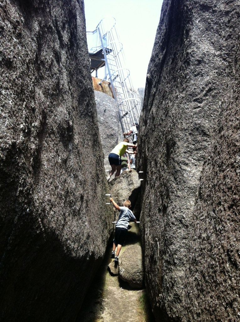 At the top was a balancing rock so we had our photo taken “holding it up”. Further on, Aaron declined to come and started back down the mountain, we were warned that the terrain changed dramatically. Signs stated not to continue if you were afraid of heights, couldn’t scramble over and between rocks or climb up a 7 meter ladder suspended over open drops. We were intrigued. Caleb handled it all very well, passing some other adults who decided to turn back. We were impressed with the structure holding up the walkway providing views above the forest and beyond. How on earth did they get all the material up here? We assumed a lot if it must have been dropped in by helicopters. A stunning view and well worth the effort. If you are in the area, you absolutely must put it on your list and even use it as motivation to increase your fitness!