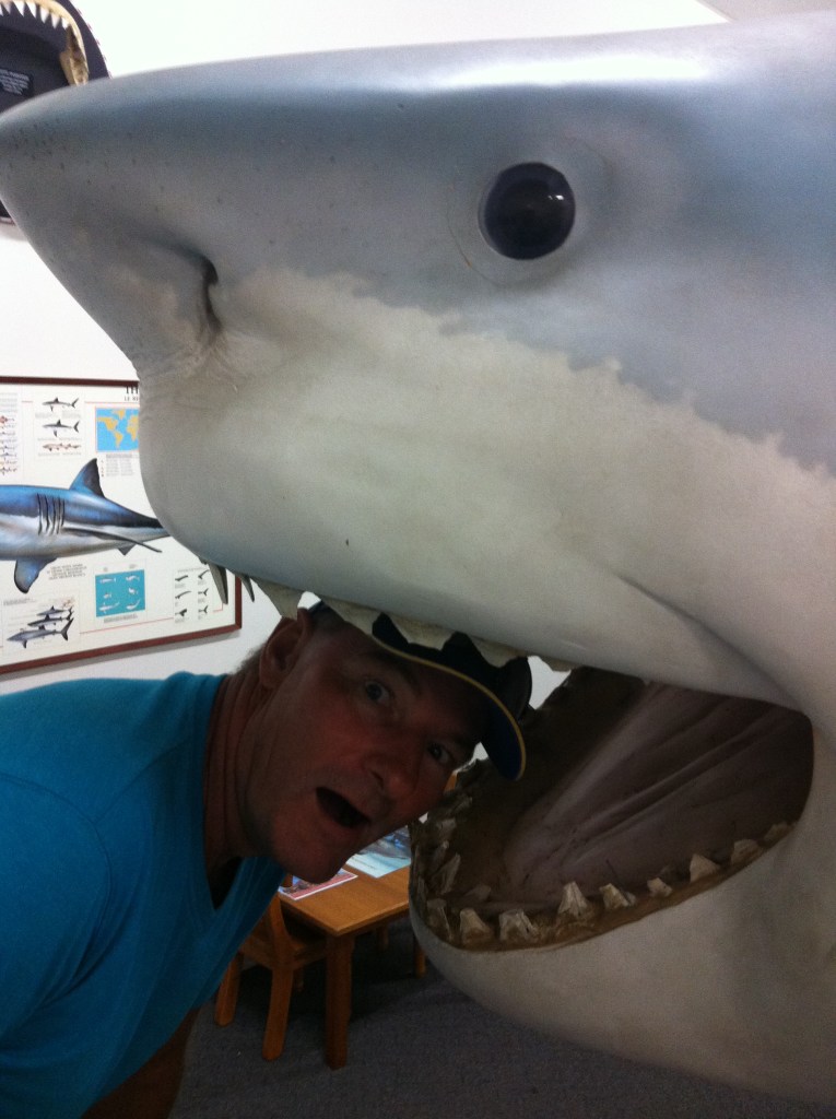 The Shell service station had a display in a dark back room which Ray led Caleb into with his eyes closed. When I turned on the lights, he came face to face with a full scale Great White Shark which was hanging from the ceiling.