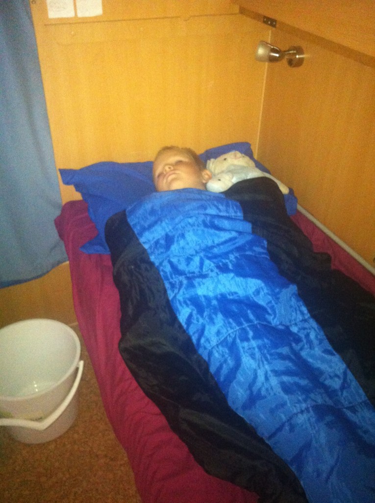 We managed to convince him to get on the toilet, stop waking up the whole caravan park and to sit until something happened. Which it eventually did. He was shivering and very pale. We wrapped him up warm and put him back to bed. He slept on and off for the next few hours and woke up again declaring himself fixed.