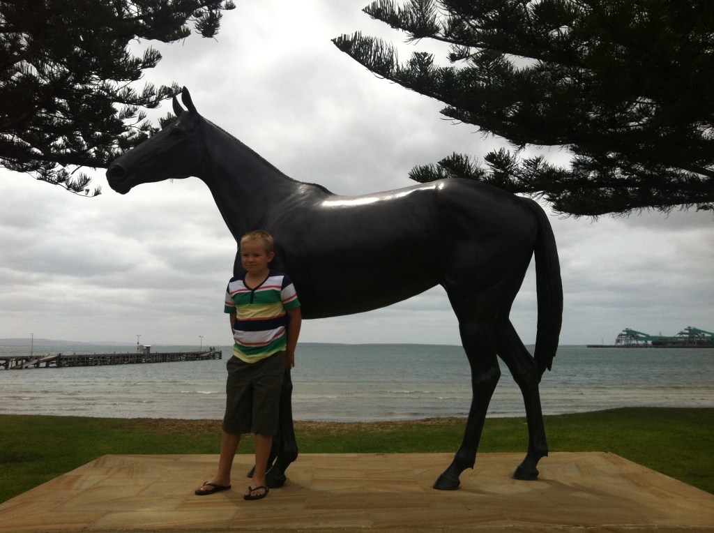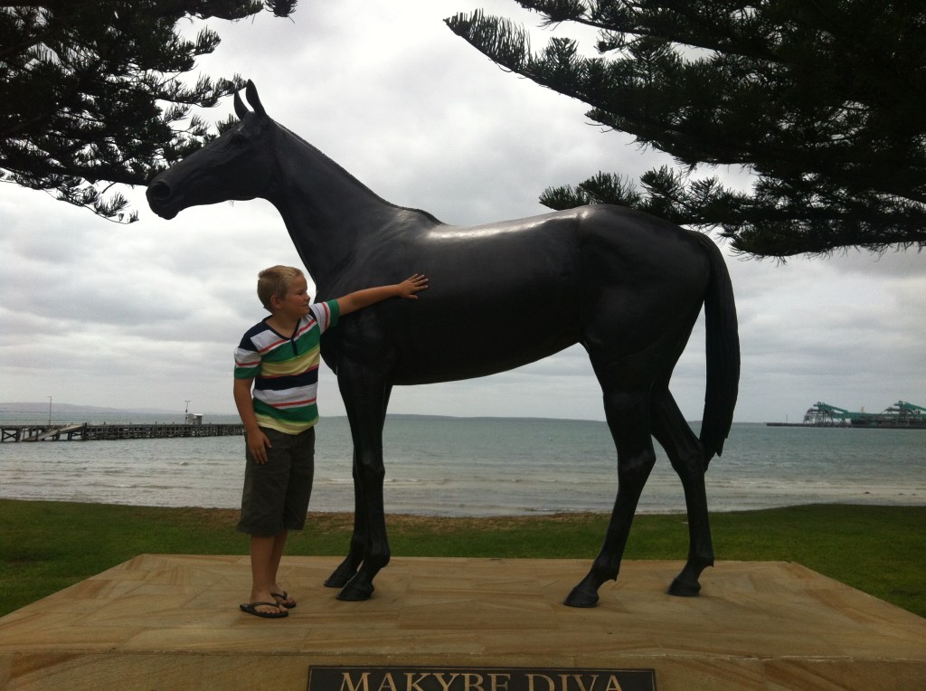 Mystery illness dealt with, we ventured into the town of Port Lincoln. A town which had resisted the shopping centre mentality and which is still a delightful warren of street shops. It was pleasant walking along the foreshore where they have a life size cast of Makybe Diva the accomplished race horse. There was no mention of it on the plaque, but perhaps the horse or owners originated from here? We weren’t sure.
