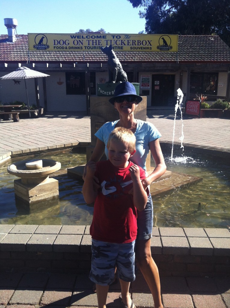We took the turnoff and joined the Hume Hwy. Gundagai loomed and we had to stop and check out the ‘dog on the tuckerbox’ which is nearby. This statue is an historical monument, erected after being mentioned in a poem in the 1800s. When we arrived and saw the monument, Caleb threw some coins into the fountain and made 3 wishes. Each wish, he later revealed, related to the poor dog who hadn’t moved and couldn’t be patted or fed. Caleb wished for him to come to life and to find someone to look after him. He must have thought the wishes had to be related to the dog, otherwise I’m sure he would have wished for Lego or some Star Wars figures.