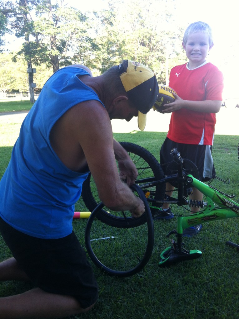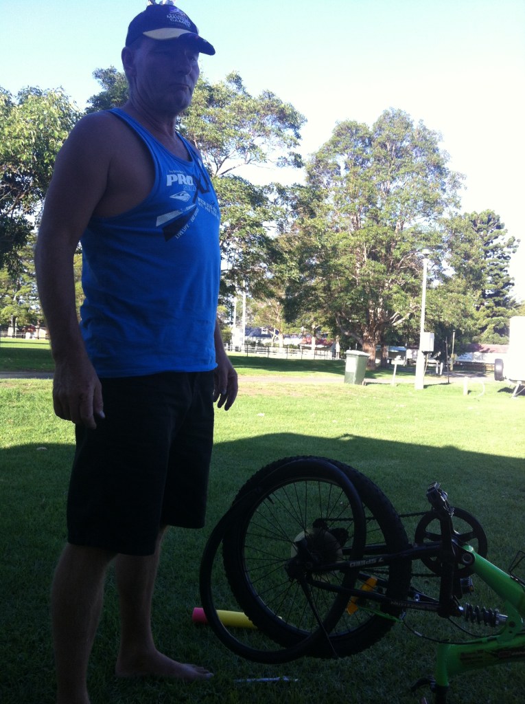 Ray busied himself fixing Caleb’s flat tyre only to find out later that the new tube he put in also had a hole in it. He wasn’t impressed because he had some difficulties putting the gears back on properly and the whole exercise took him more than an hour.
