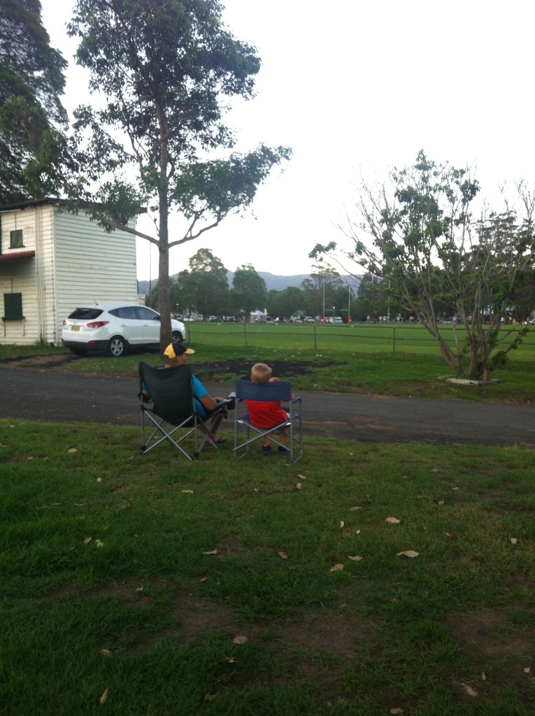 The local footy teams (rugby) were playing a Saturday night game right next door on the oval so Ray and Caleb pulled up a chair to watch and try and work out the rules. They decided to have a kick of the footy on the oval after the game. Real AFL footy that is!
