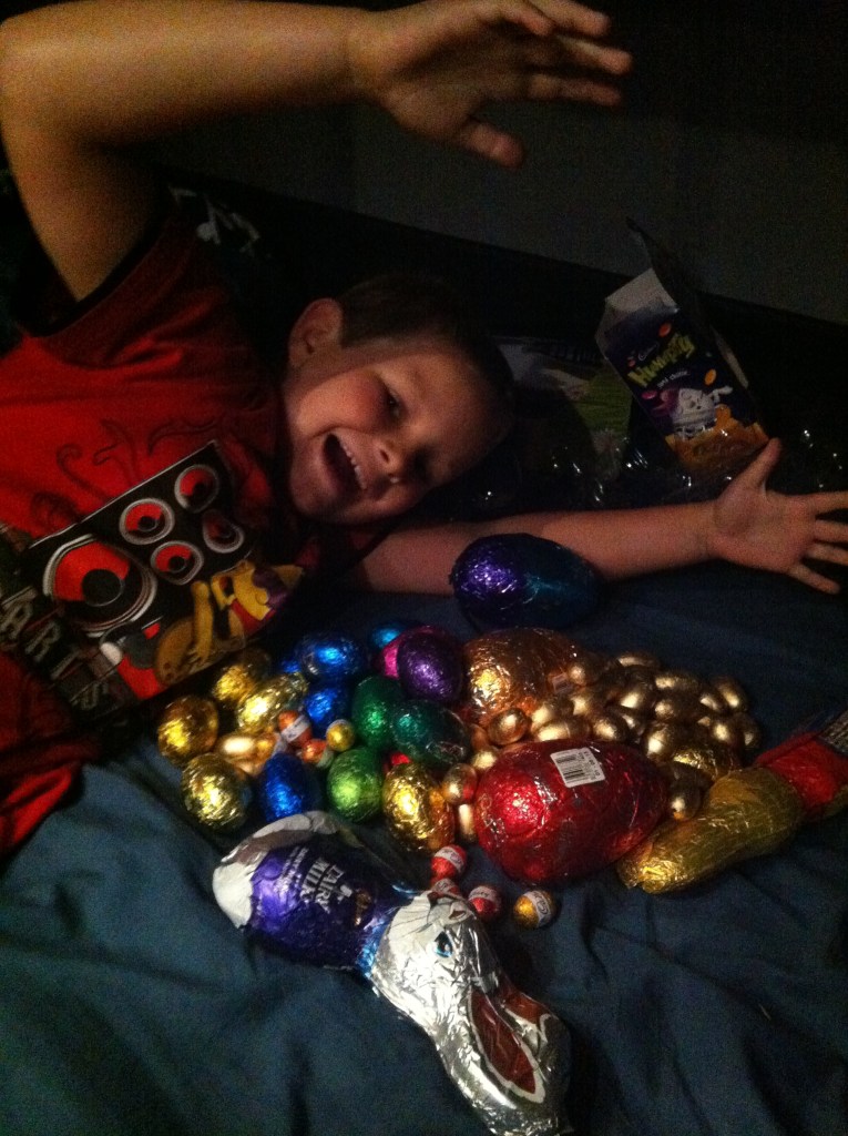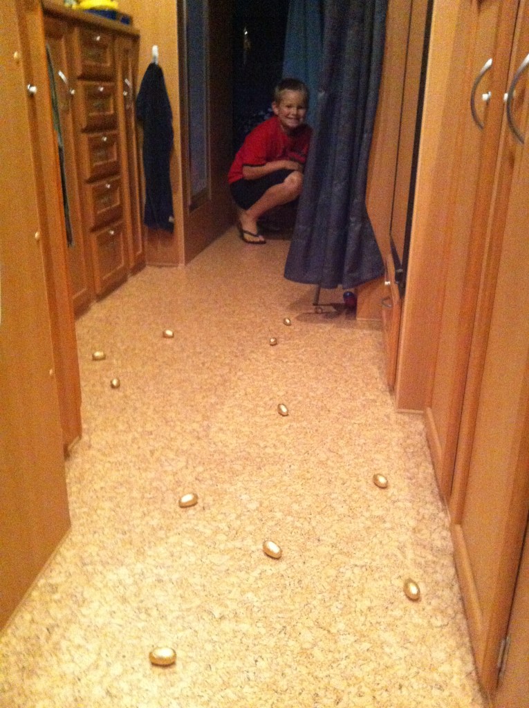Caleb had been pinning his great hopes on the fact that the Easter Bunny would find us and he was so happy when he woke up and found chocolate mini eggs everywhere throughout the caravan. After collecting them all he wasted no time digging right in and eating as many as he could before he needed something more substantial in his stomach to start the day.