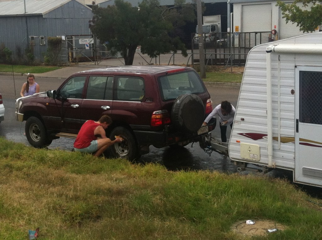 We stopped for lunch at a park on the way into Tamworth, knowing that large towns hold many culinary temptations for us travellers. It didn’t help much though because we ended up at Bunnings buying sausages to aid Tamworths Toy Library. Ray had discovered that the local high school was running a car wash at Bunnings to raise money for the Tamworth Hospital. When we turned up towing our van, there were a few heads shaking but they agreed to wash both the car and van for $20. We didn’t really expect a top notch job (luckily) and we were content that the money was going to charity. I felt sorry for the poor supervising teacher who was doing more work than the kids who looked like they were enjoying their usual Saturday catch up at the shops.