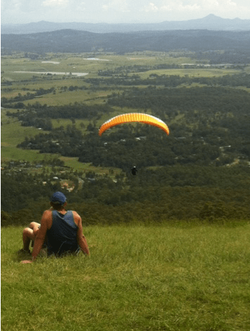 We came upon a clearing at the side of the road where hang gliders were setting up to take off. We were 550m up in the mountains and the wind was pretty strong here so we guessed that it was probably a favourite spot for para-gliders and other wind reliant sportspeople. Our assumptions were confirmed when quite a few people turned up like us to watch and then we noticed the spot marked on a map of the local area as “hang gliders”.