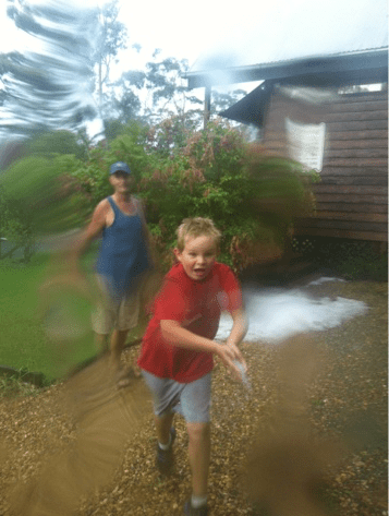 Caleb thought it was clever how the forest shielded us from much of the downpour, until there was a break in the overhead foliage and he copped really cold, heavy rain. We bolted for the car.