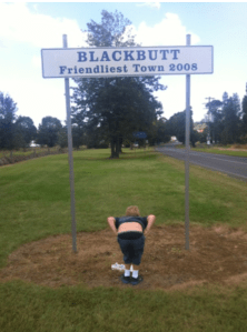 He has taken to shelling his own nuts at night (peanuts) as I shell mixed nuts with a nutcracker. Delicious! We make quite a mess between us with bits of shell flying everywhere throughout the caravan. He planned for us to visit there today and we prepared ourselves for the 2.5 hour journey (one way). On the way we drove through Blackbutt. We all checked our skimpies but Caleb was the only one wearing black underwear so he got to be in the photo that we just had to take. We just couldn’t pass up this photo opportunity and I bet may thousands of others haven’t either.