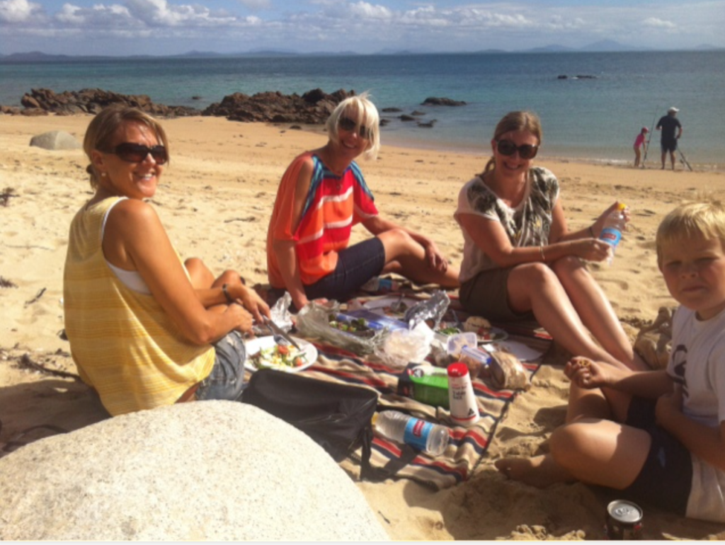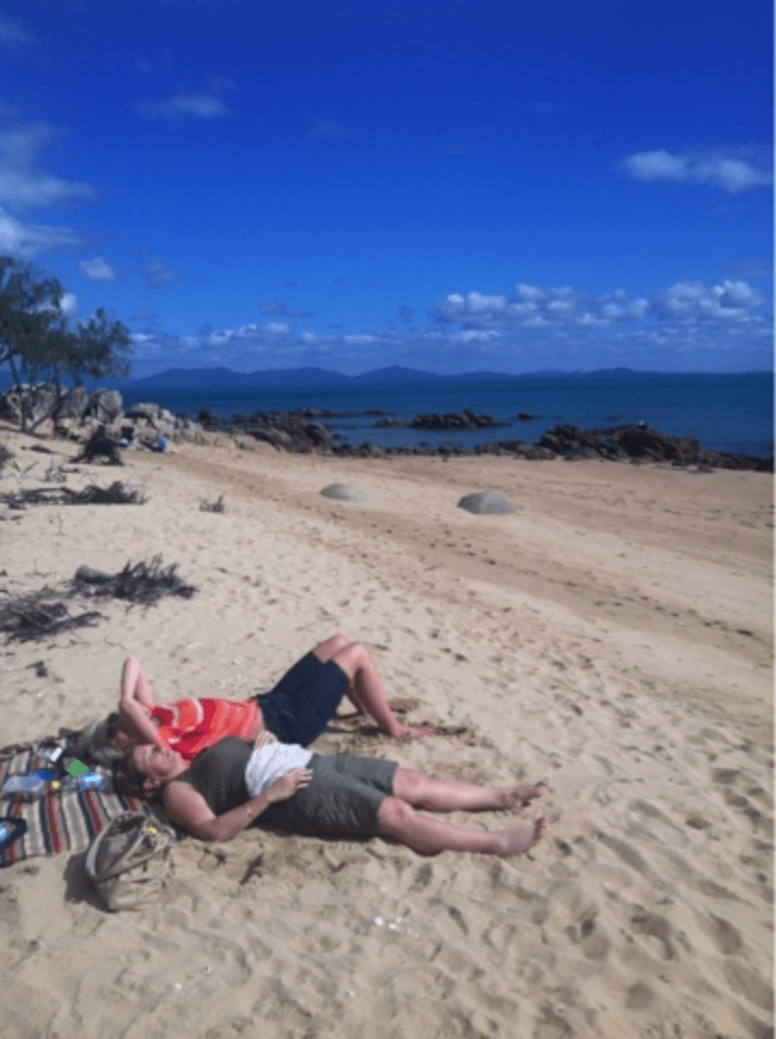 The area including the islands and magnificent beaches was named by Captain Cook in 1770 when he cruised past them 50 days after Passover (or Easter as we better know it). Karen and Linda had a little “Passout” of their own after lunch and took in the warm Queensland sun while Caleb explored the rocks and I dropped a handline in for a fish.