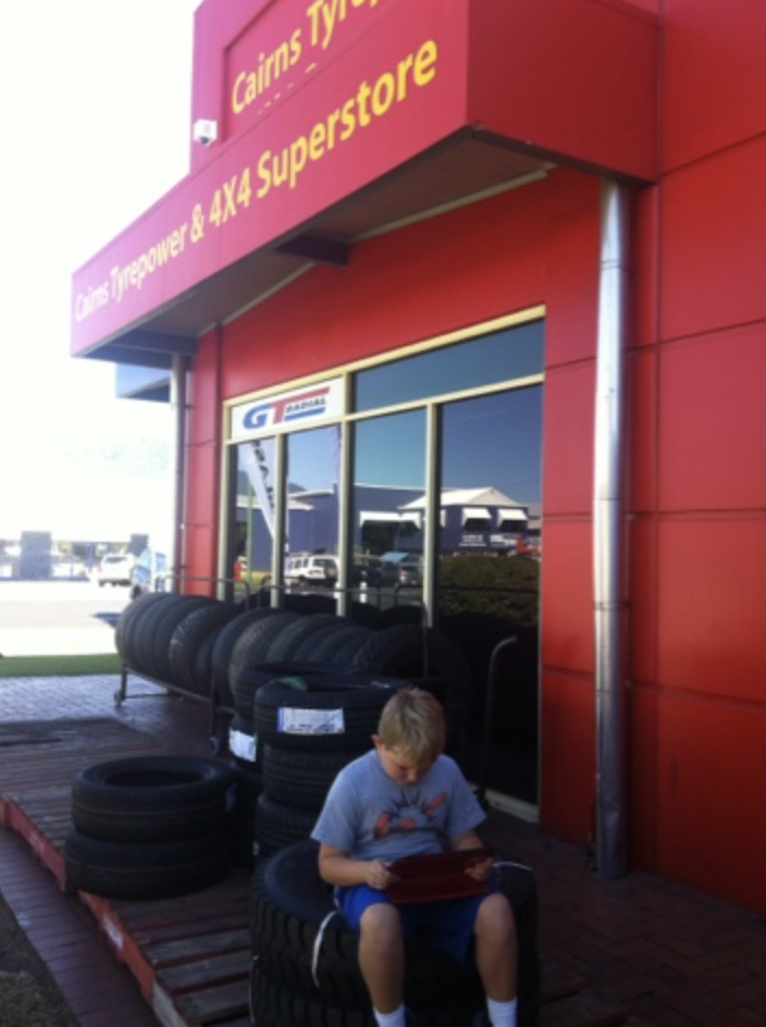 We had the van booked in to get a new tyre this morning in Cairns so we packed up, kissed and hugged everyone goodbye and then headed off. We had some waiting to do at the Tyrepower store as they freed up the only bay that would fit the caravan in. Finally, it was fixed and we were on our way. About 1km up the road we could hear this incessant noise which seemed to be coming from the car tyre. We pulled over, checked the tyre and discovered a bolt through the rubber. We absolutely couldn’t believe it.