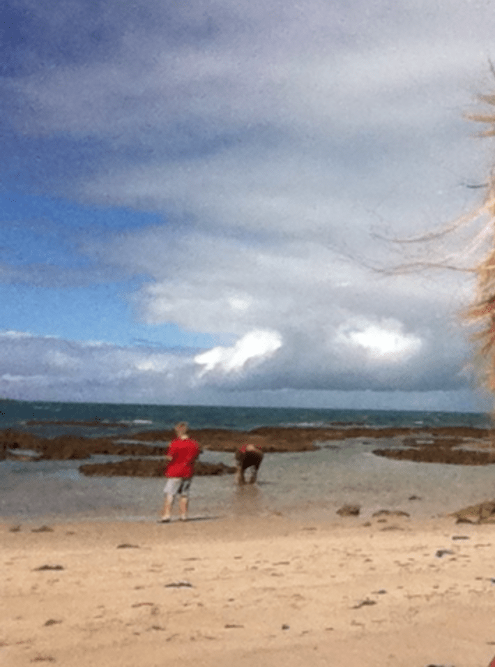 Down on the beach Ray and Caleb started a rock skimming contest while I explored the driftwood and variety of items that had washed up on the beach. The plastic was plentiful along with thongs, kitchen brushes and other household items. There were quite a few coconuts, some that had been smashed open by crashing on the rocks as they journeyed into shore.