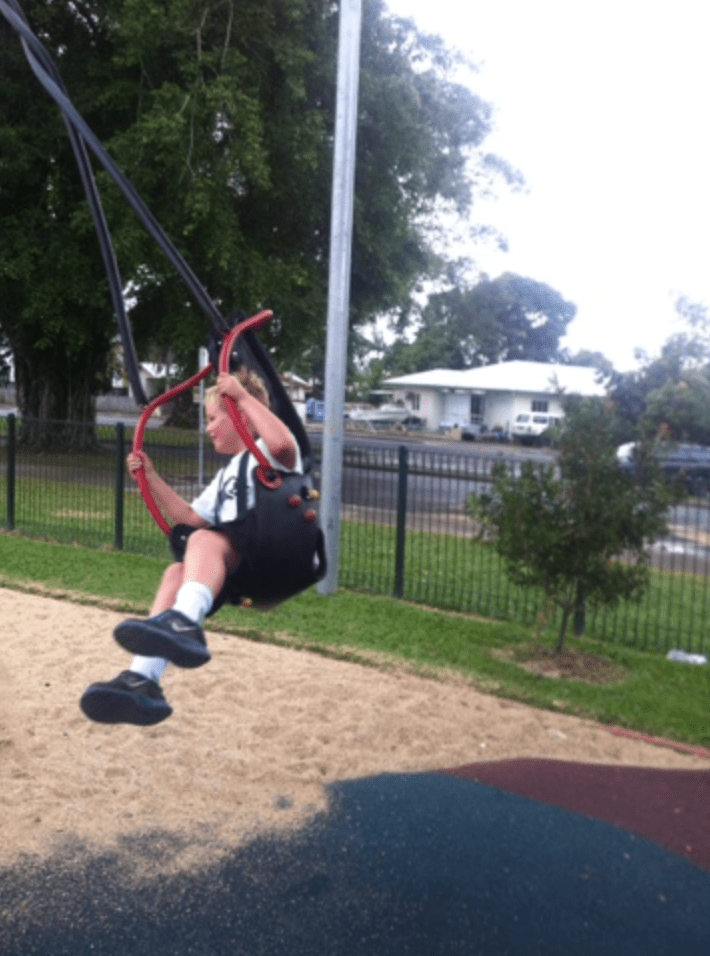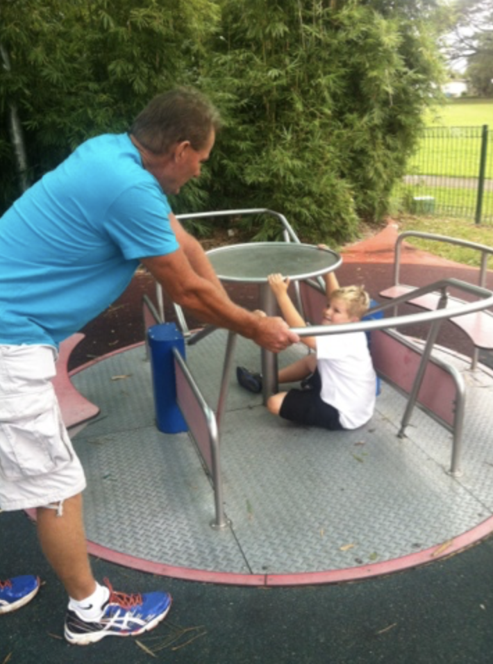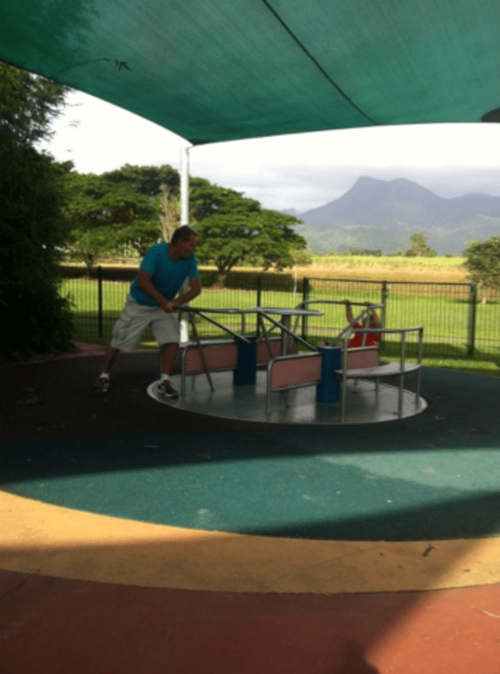 After lunch we were getting a bit of cabin fever, easily achieved in a caravan on a wettish, windy day. We put on our runners and headed to the local playground braving the conditions. It was difficult to tell who was having the most fun, the little kid or the big kid!