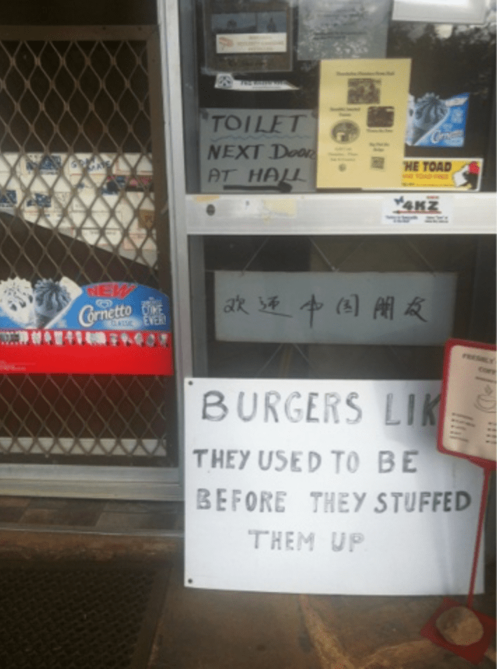At the cafe we noticed a sign we couldn’t ignore. “Burgers Like They Used To Be Before They Stuffed Them Up”. It beat the “Best Hamburgers in Far North Queensland” sign in the window next door, so we decided we’d have to skip our planned dinner and order a couple of these. They were massive as we’d hoped for $ 12.80 each, so Caleb and I shared one. They were delicious and tasted just like hamburgers used to (before they stuffed them up!)