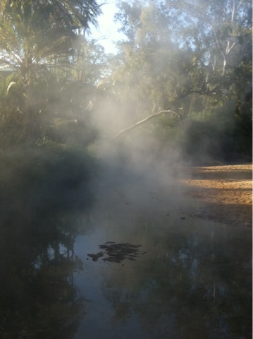 After lunch Ray and I wandered to Nettle Creek, just next door to the caravan park. This creek supplies the health springs and can be as hot as 75 degrees. We only found this out later, after we had kicked off the thongs and charged into the creek. We exited faster than we entered! It was boiling! We stood back and took a look at it. There was steam rising off the top of the water, a clear give away as to how hot it was.