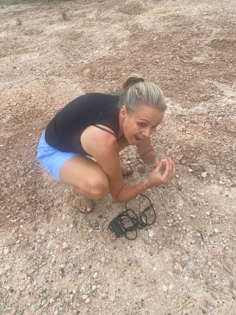 In between drizzle we explored the park. This one is a doozie with doggie daycare, an off lead dog park, a gemstone fossicking area – it’s huge. It has over 100 sites. We took Henry to the off lead park and stopped to do a bit of fossicking along the way. While I was looking, believe it or not, I found some white opals! They were tiny, but they were there. Finders, keepers.