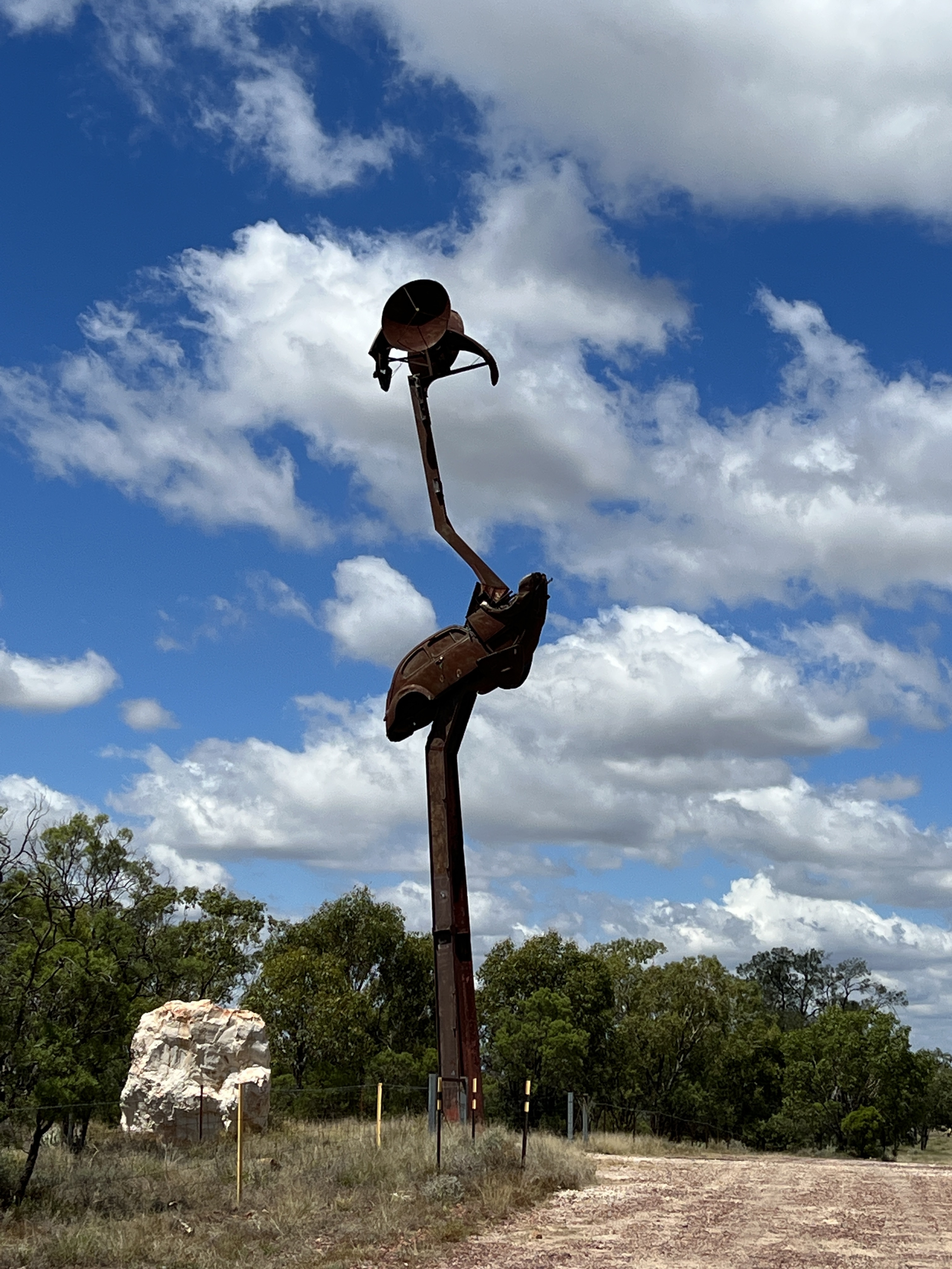 Stanley is 18 meters high and is made from scrap metal, most notably VW Beetle bonnets. He was supposed to be on the Birdsville Track as intended by the artist, but the cost of getting him there was too much. A bit of bureaucracy also came into play. The people of Lightning Ridge came to the rescue and gave Stanley a home standing on the ridge for which the area is named. He houses a time capsule in his belly to be opened in 2063.