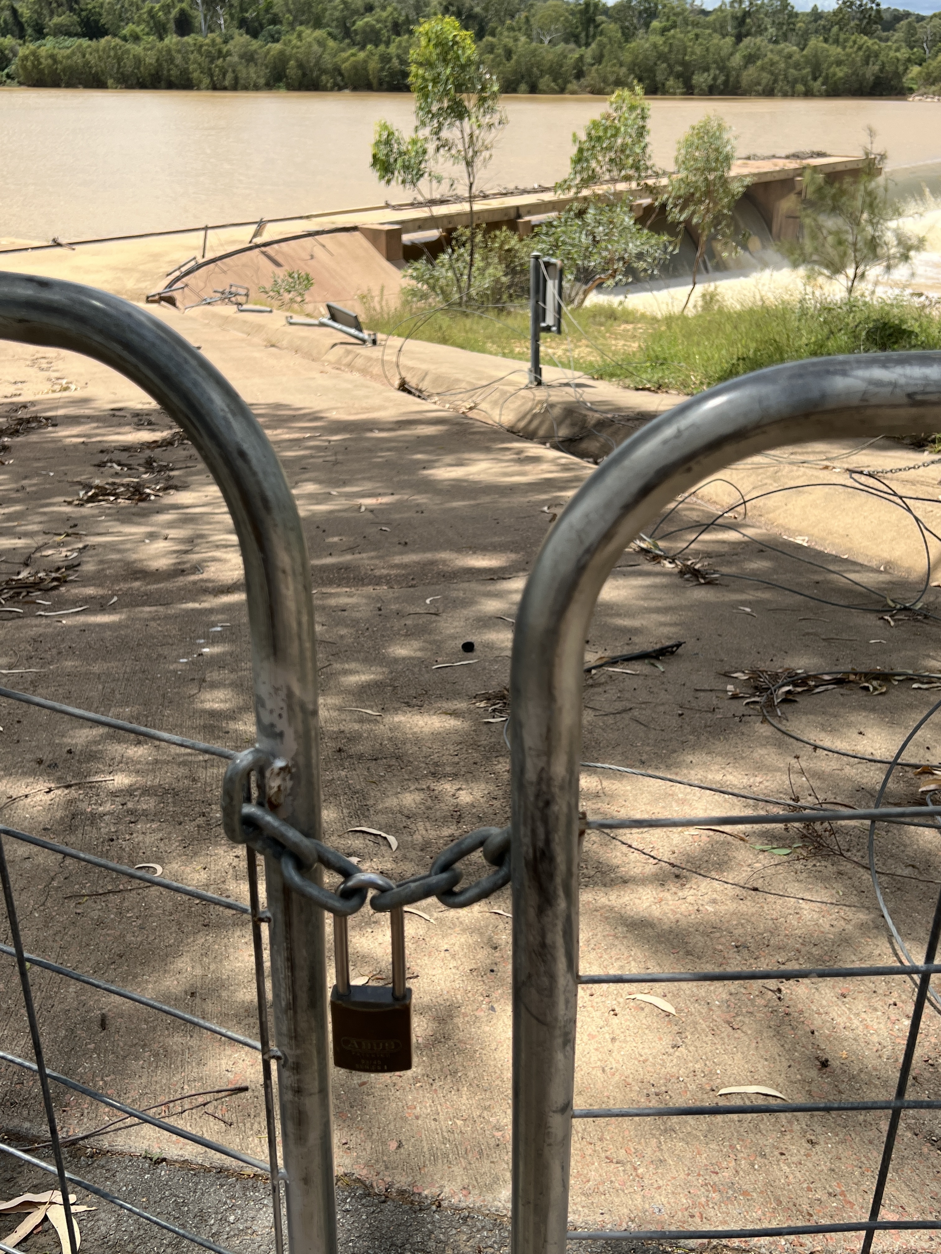 We kept going. A couple of shallow river crossings later. We arrived at yet another sign that announced that the weir was closed. This still didn’t stop us. Pressing on, we drove til we came to the weir. It had obviously suffered damage from the recent flooding and a simple padlock on a gate kept out anyone from venturing further. “Never in Victoria!” I thought. Always the over regulated state and it’s inhabitants never to be trusted to do the right thing, there would be armed guards and barbed wire, actually we wouldn’t be able to venture this far at all.