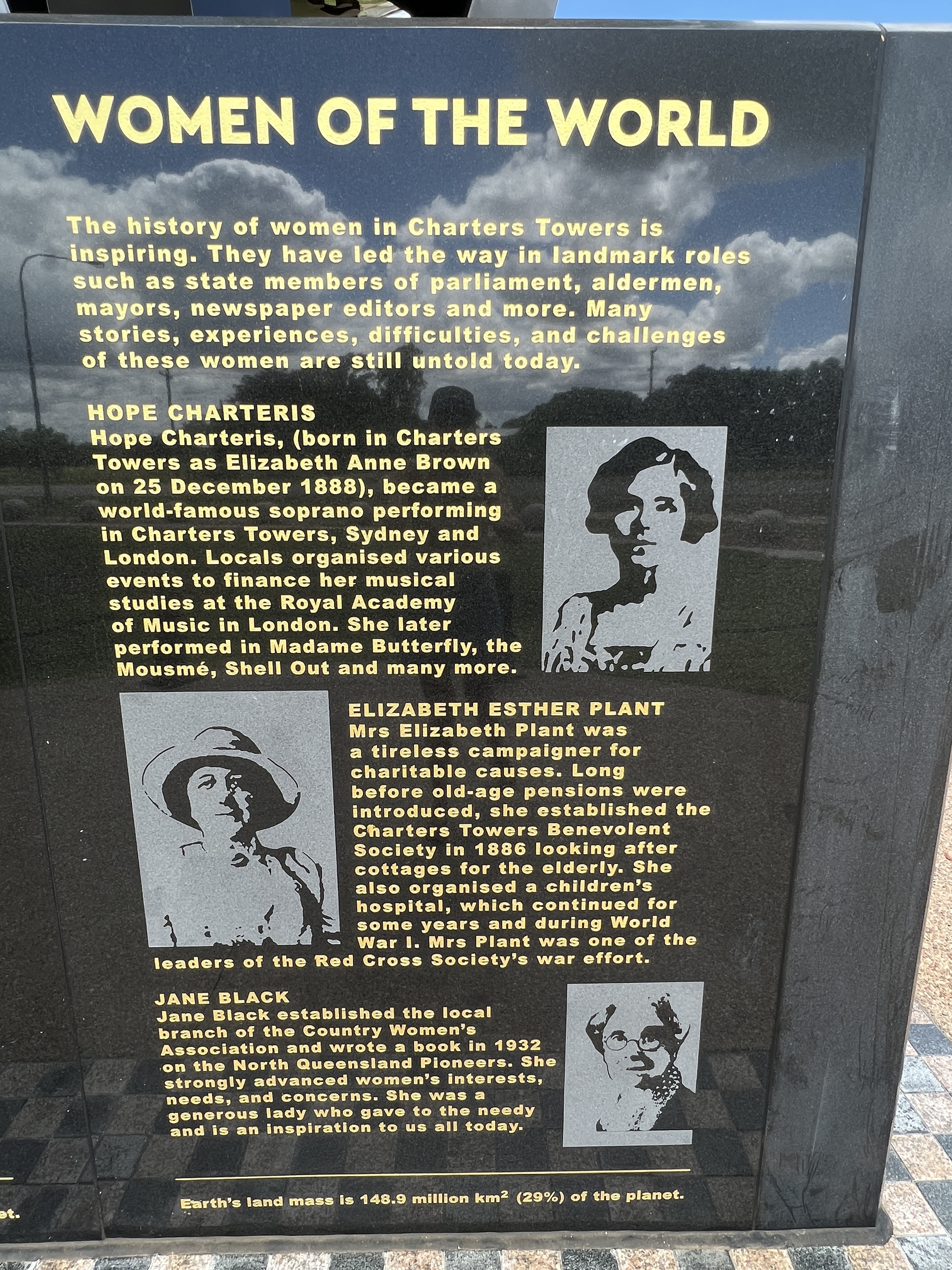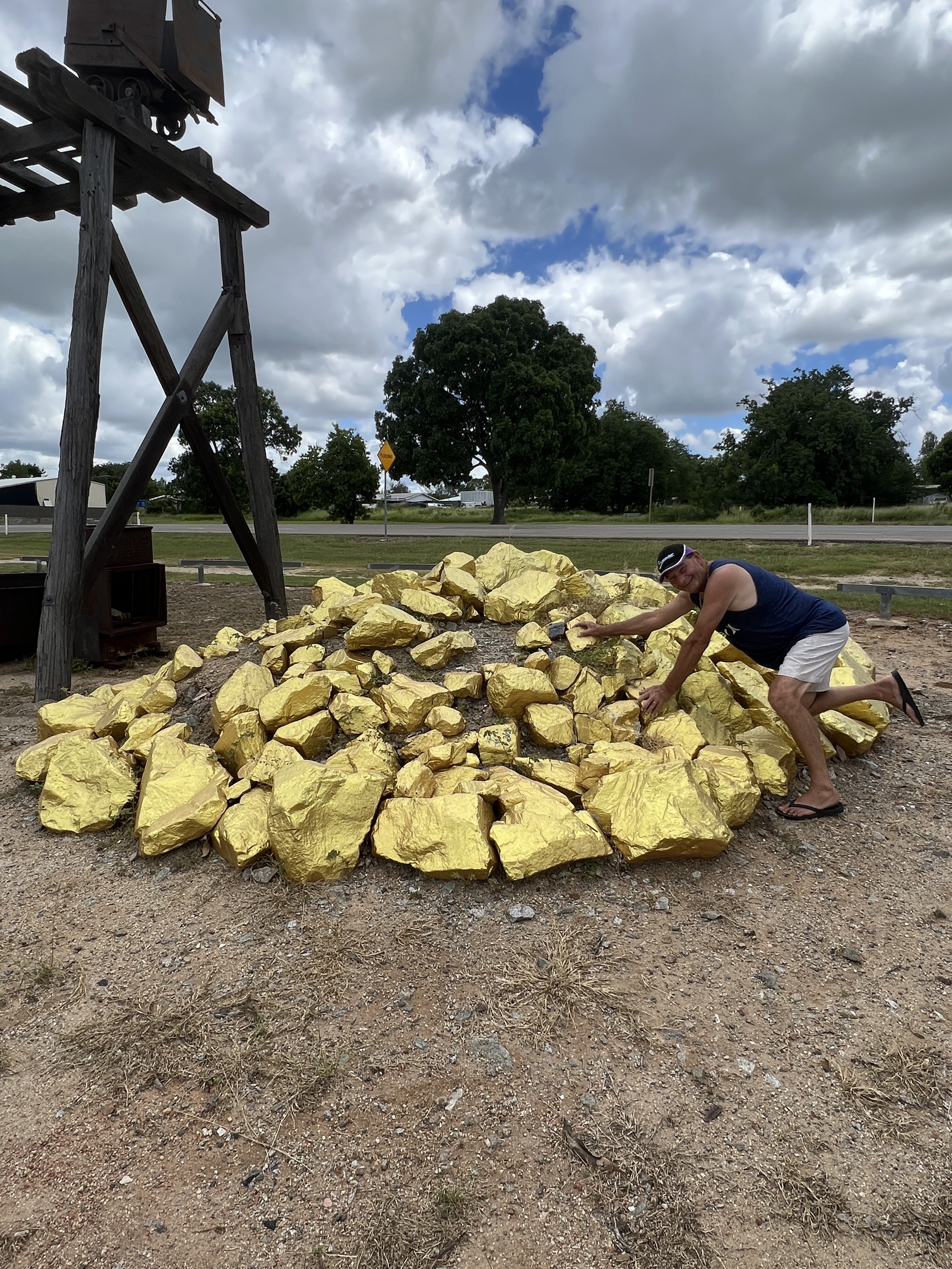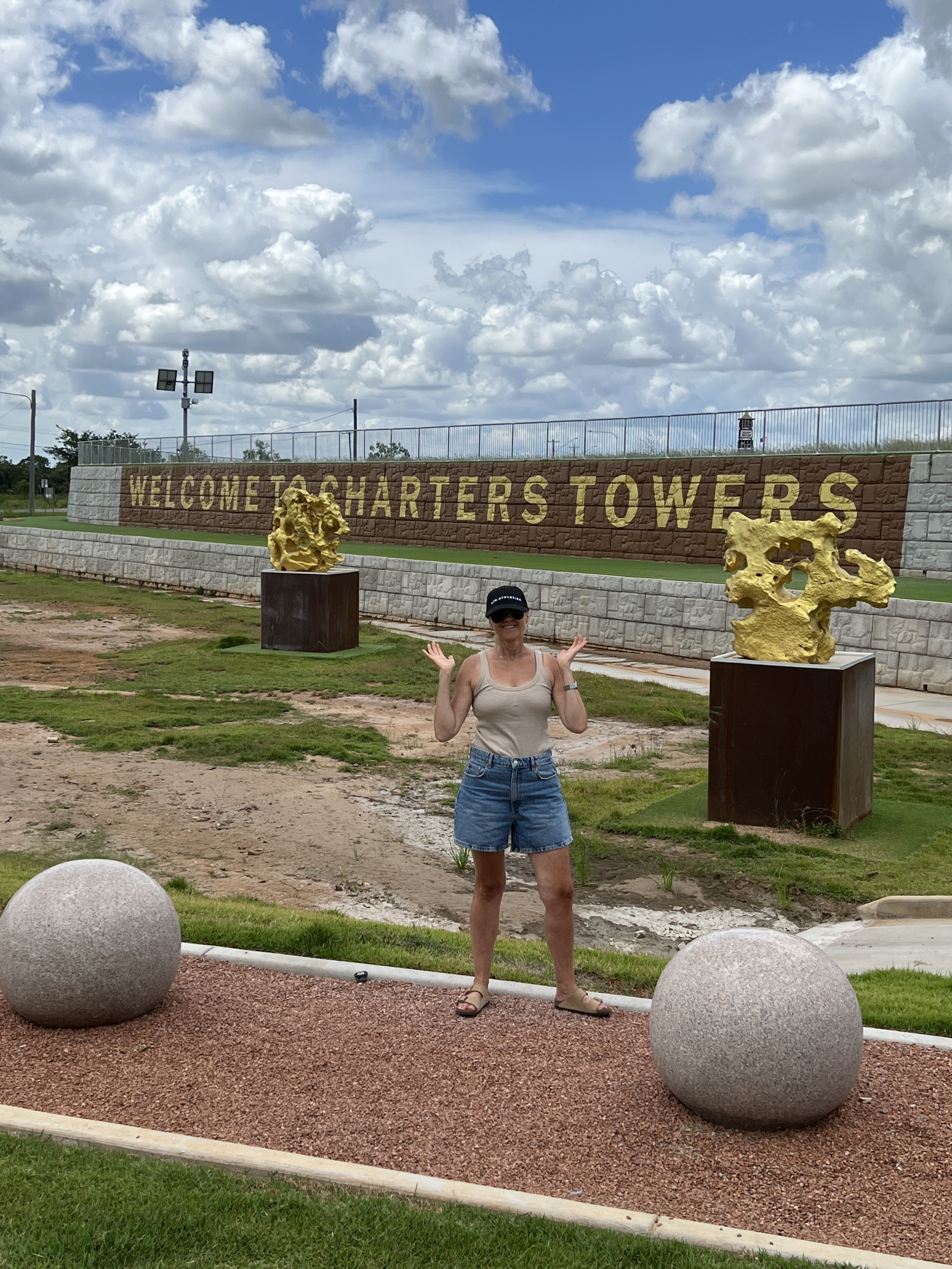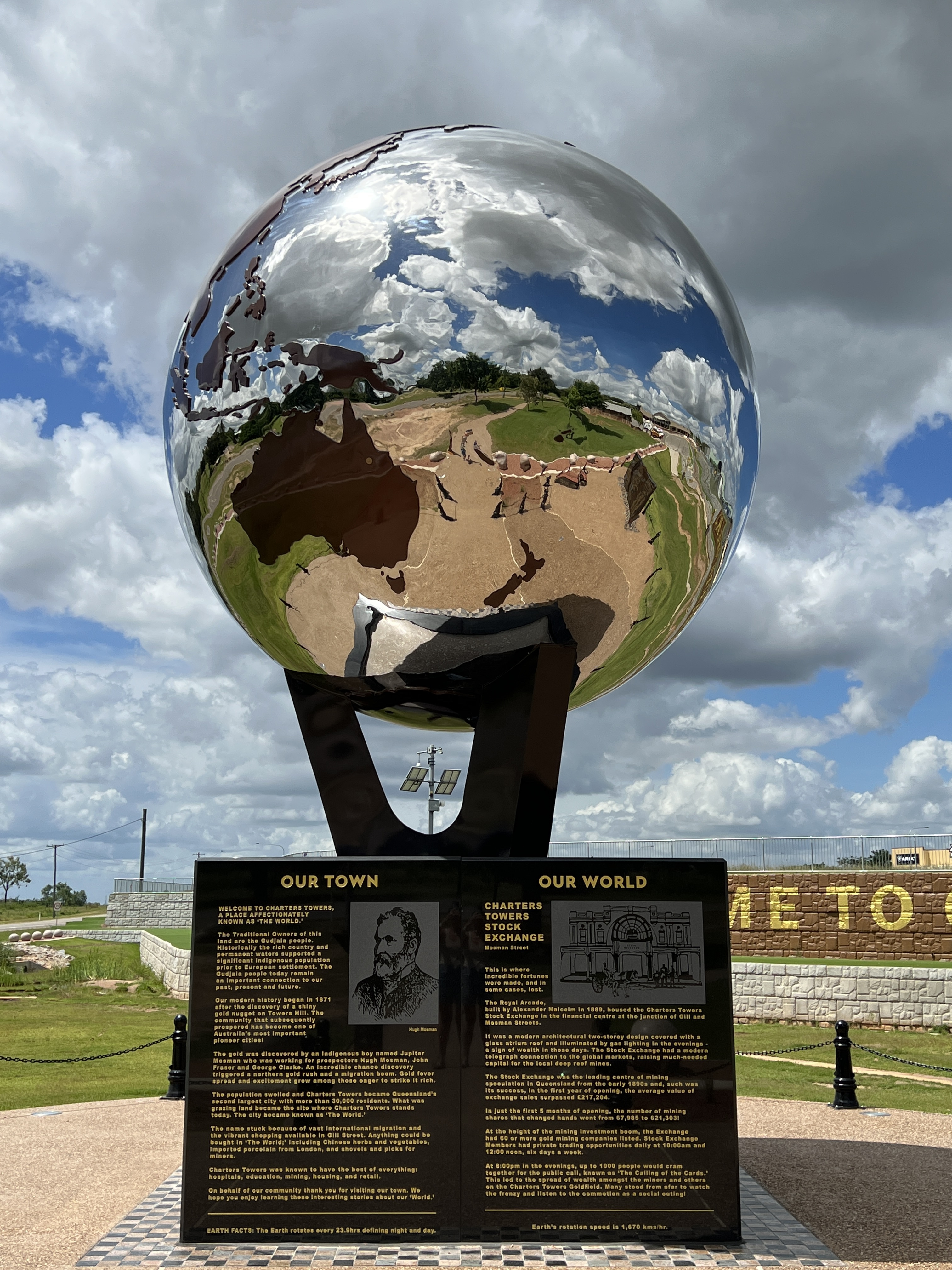 Somewhere in Charters Towers there was a tourist committee, who had really put their heads together and come up with a tremendous idea, (and a huge budget), and really thought about what was important in the history of charters towers, and what tourists would like to see (and be blown away by). They had delivered. The big, silver world on its pedestal resembled the big silver bean that we saw in Chicago, USA. The granite that was used to engrave all the details about the history of charters towers in the area must’ve cost an absolute bomb because it was inlaid with gold and was so heavy and solid. We learned a lot about the history of the area and its gold rush days. It was so well done.