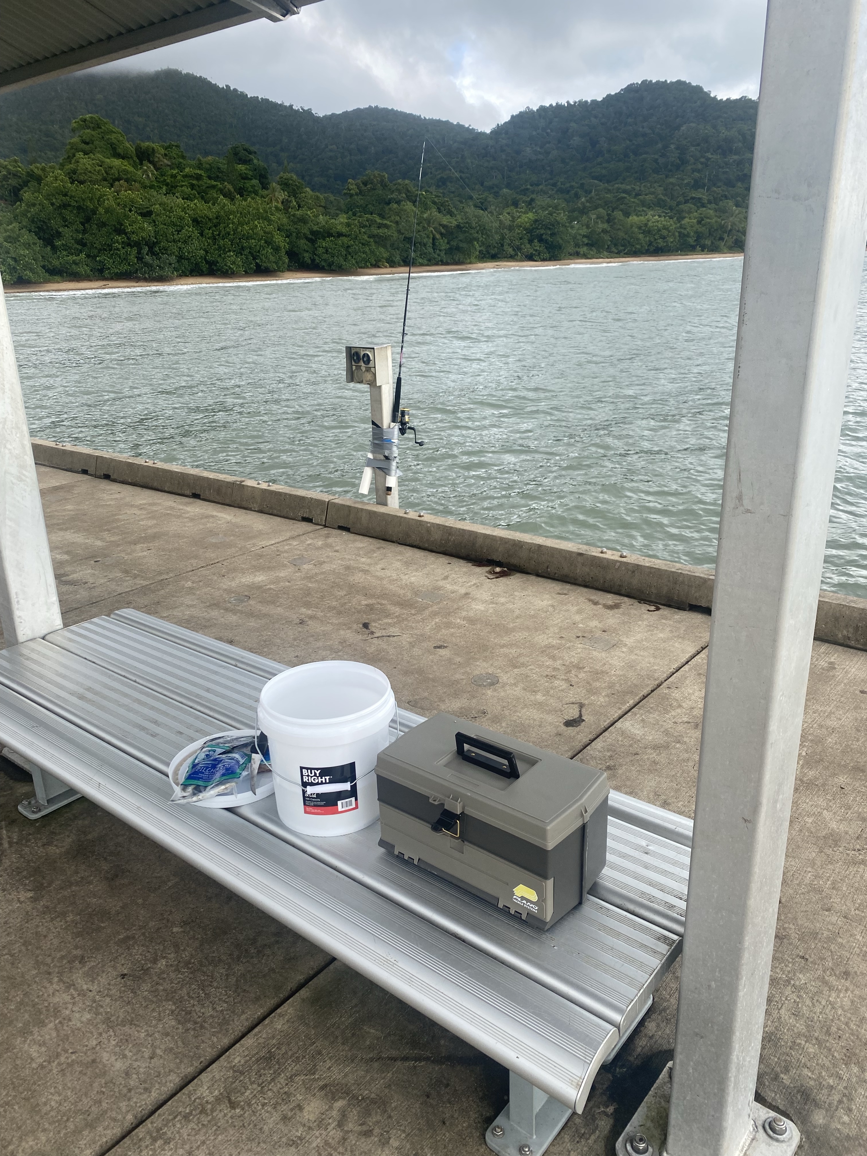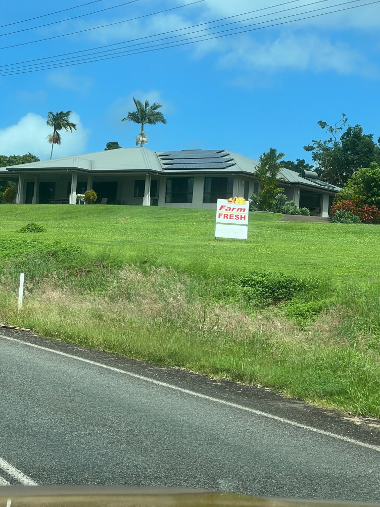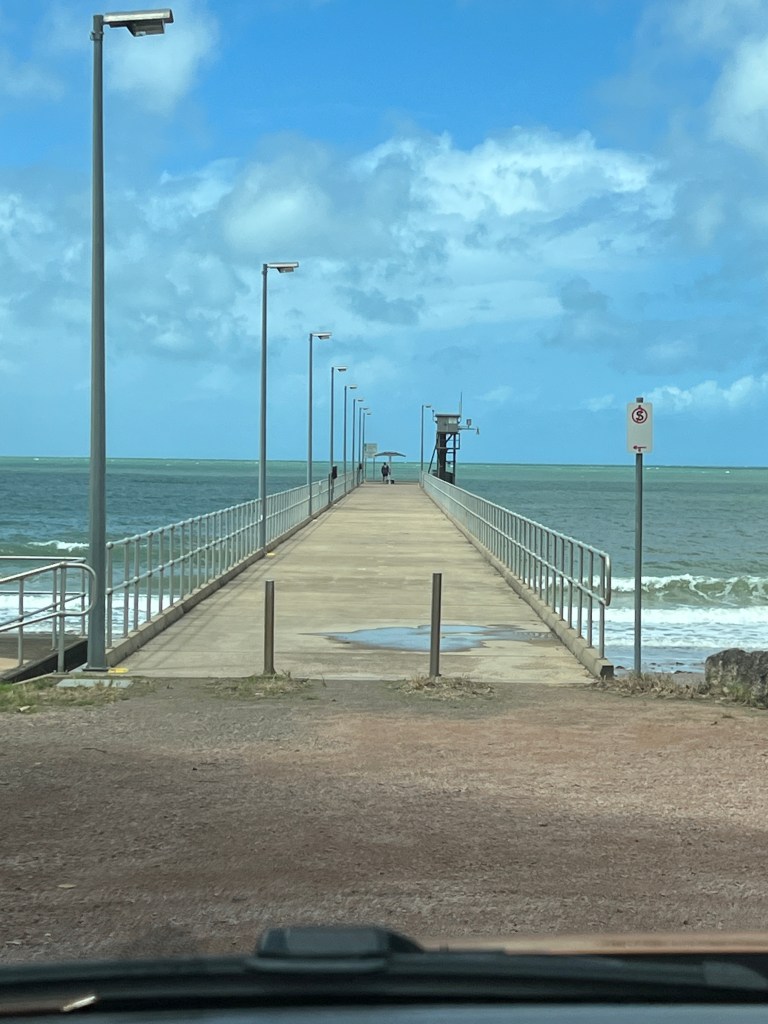 Ray returned and after lunch we went for a drive to see the Perry Harvey Jetty where he had spent half the day fishing. The rain started again so we couldn’t walk along it. We drove towards the small township of Mission Beach to get a coffee. Some of the homes here are actually on plantations so they sell farm fresh fruit. We pulled up at a honesty stall and bought some bananas. At $2 a kilogram we thought they were cheap, especially when we knew just how good they were good to taste straight from the farm with no cold storage in sight! They were absolutely scrumptious and we had to stop ourselves eating just one.