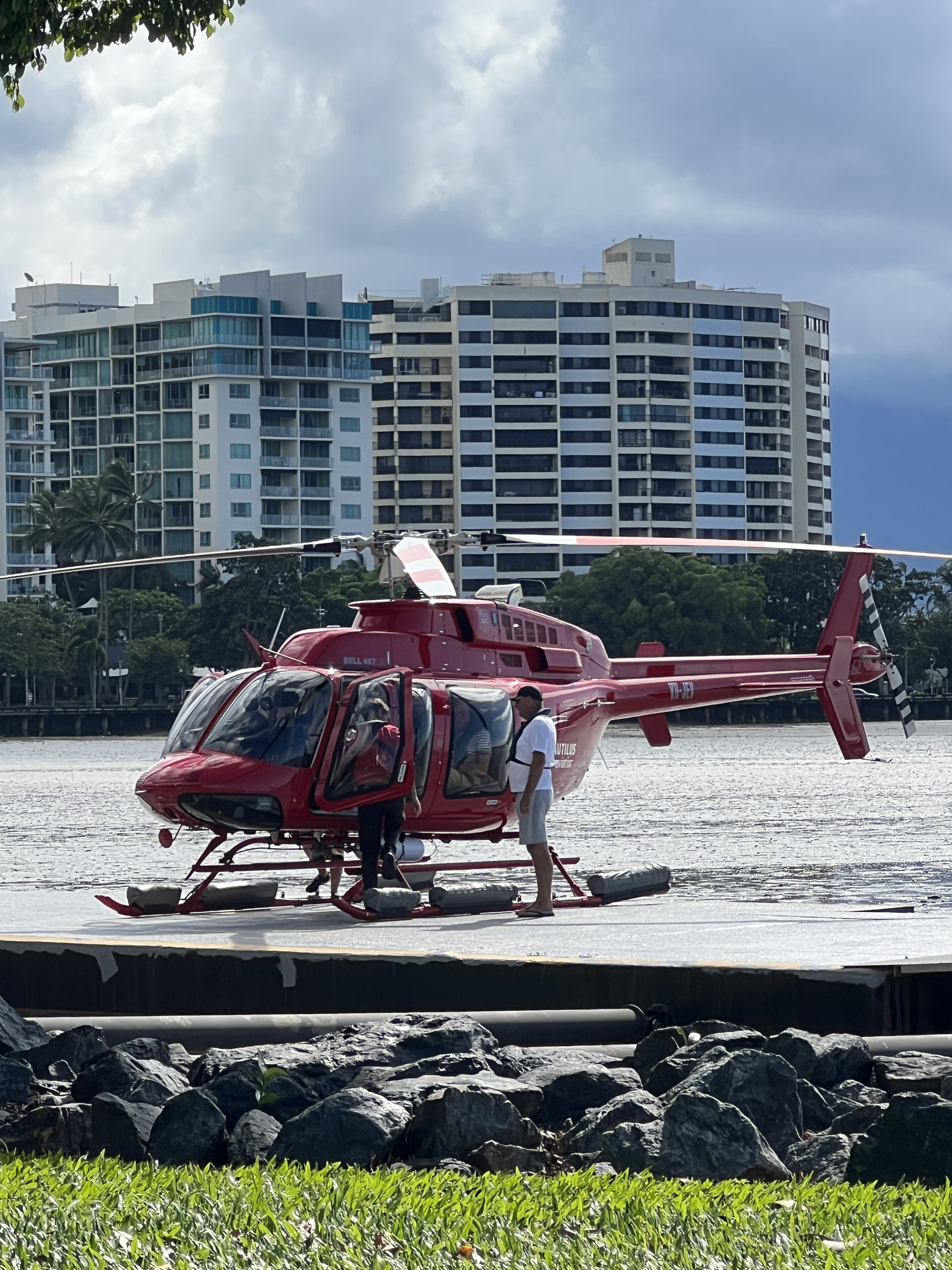 Ray has always been fascinated by helicopters and will go for a ride in one whenever he can. He’s seen some amazing sights (over the Grand Canyon in USA being the best) and one of the things on his bucket list is to get his pilot’s licence! I’ve been up a few times but I can take it or leave it and would rather shop with the dollars spent so Ray usually finds someone else to go with or goes on his own. Even though he has flown over Cairns before I suggested he go again. His birthday is coming up! Amazingly there was a spot the morning we popped by to enquire and we hung around until the afternoon, shopping, eating and relaxing until he had to be there for the safety check and take off. Ray isn’t backwards in coming forward so he asked straight out if he could ride up front next to the pilot. It all depended on the weights of the other passengers as there has to be balanced weights in the front of the helicopter and as Ray is quite a tall, solid man, he had to sweat it out for an answer until the others arrived.
