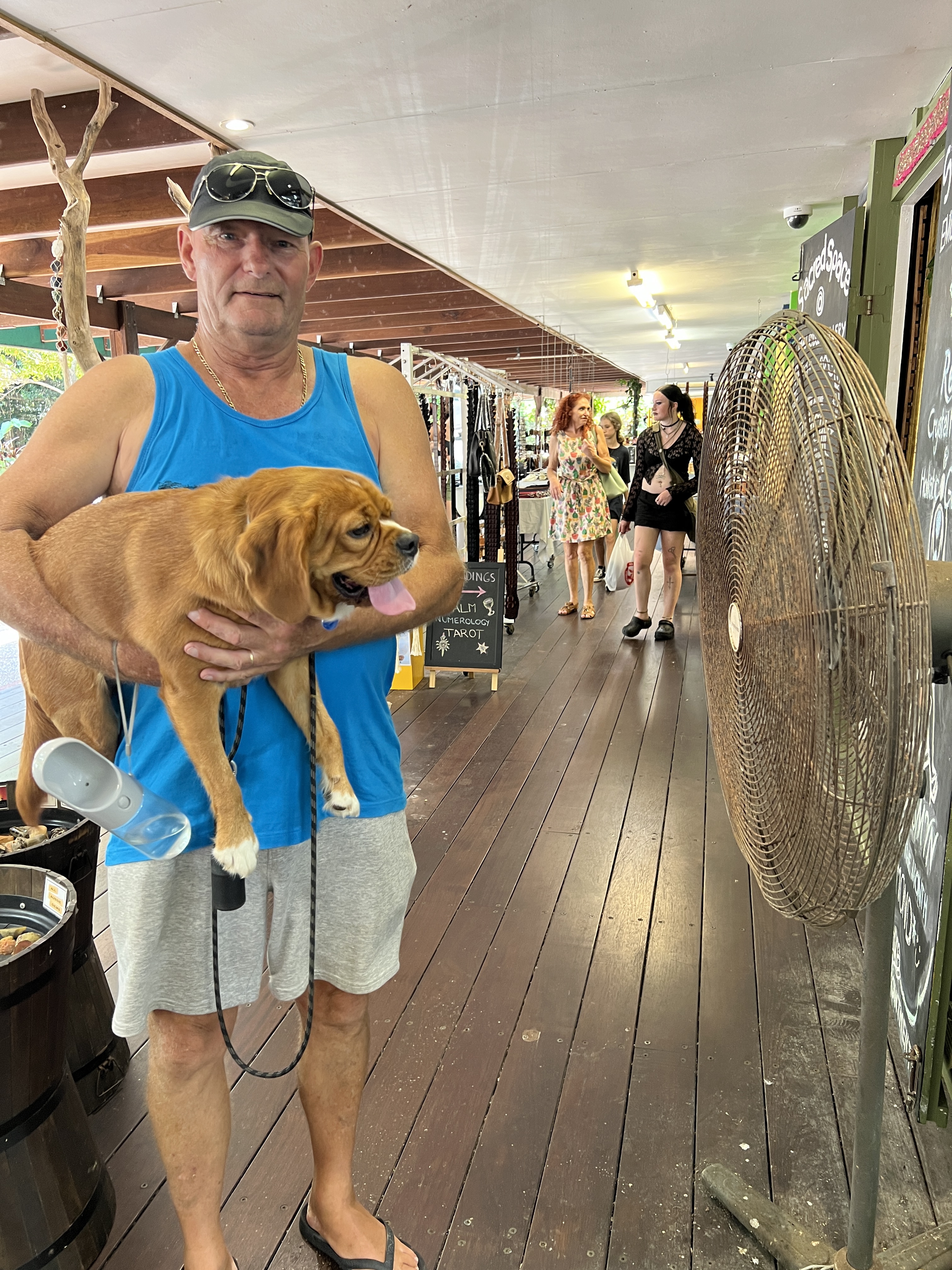 During these 10 days Ray and I returned to Port Douglas for lunch and a wander around the shops. We were particularly looking for a new singlet top or two for Ray. We went into a mens store. The air conditioning was blowing full on and Henry collapsed, legs splayed on the cool tiled floor in front of the fan. Heaven. We looked around the shop…slowly. Ray didn’t like anything I picked up. Then Ray spotted some thongs. He’s been looking for a particular brand of thongs that he bought years ago and hasn’t been able to find since. I did look them up online and can get them sent from America but with postage and the conversion rate they were going to be very pricey. Well, Ray had just spotted the brand. He was checking them out and asking for his size, (12) and was doing the “Ray prance” to test out the comfortability rating. While he was prancing, another couple entered the shop.