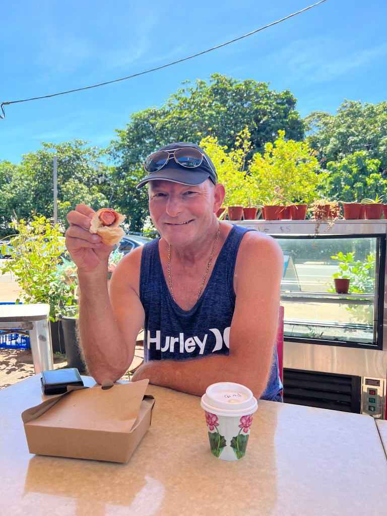 Not only was this hotdog Rays favourite brand (Don skinless), but it was served in a soft roll. Just how he liked it. The cafe was a mum and dad business and their two kids were “on the hop” as Ray put it, helping out and doing a great job. They were delivering meals to tables, working the till, packing orders and the son even came out and refilled the dog water bowl for Henry. Ray chatted to them as they made his order and the door continually opened with new customers who the father said were both travelers and locals. The coffee was also great!