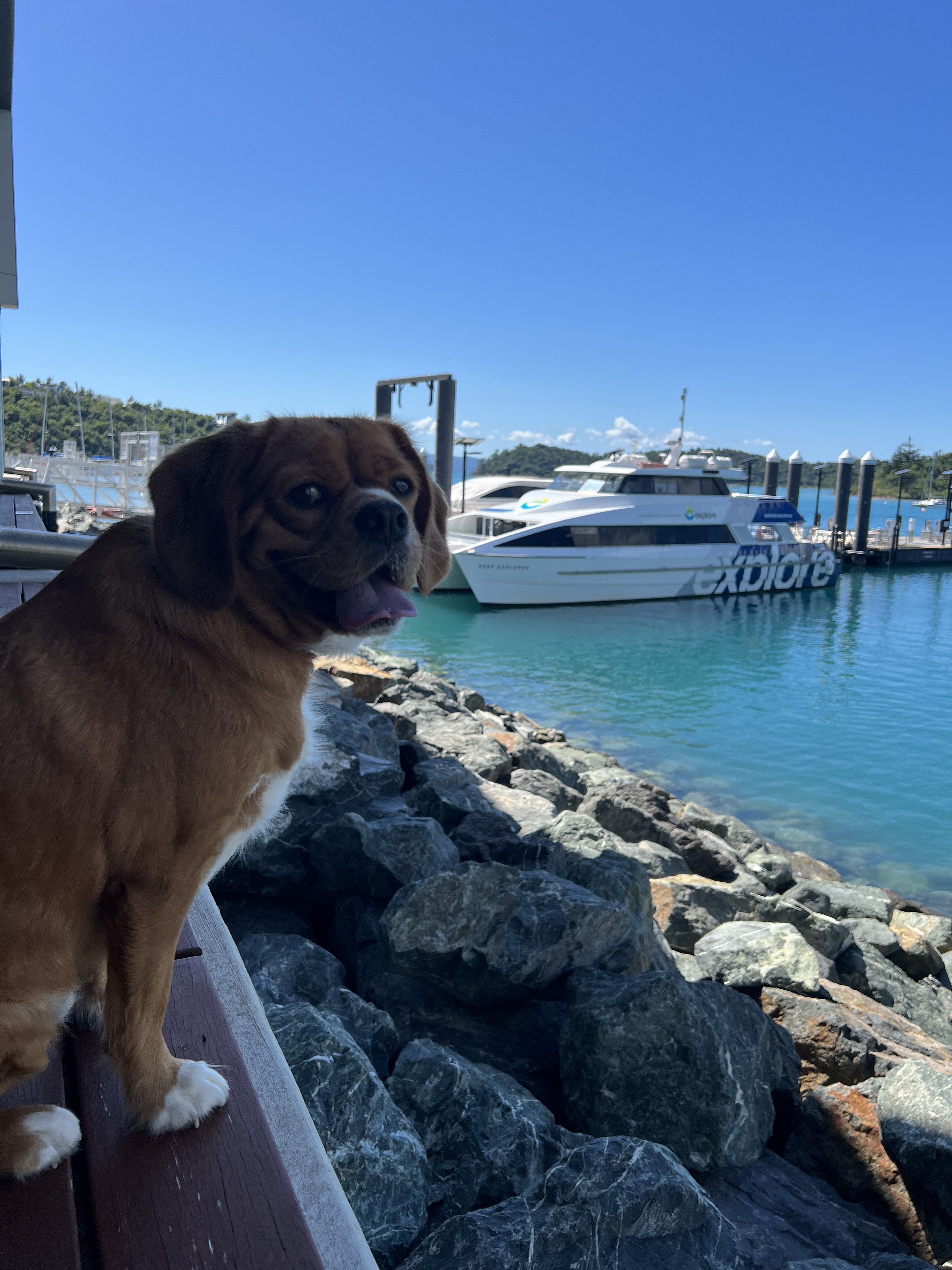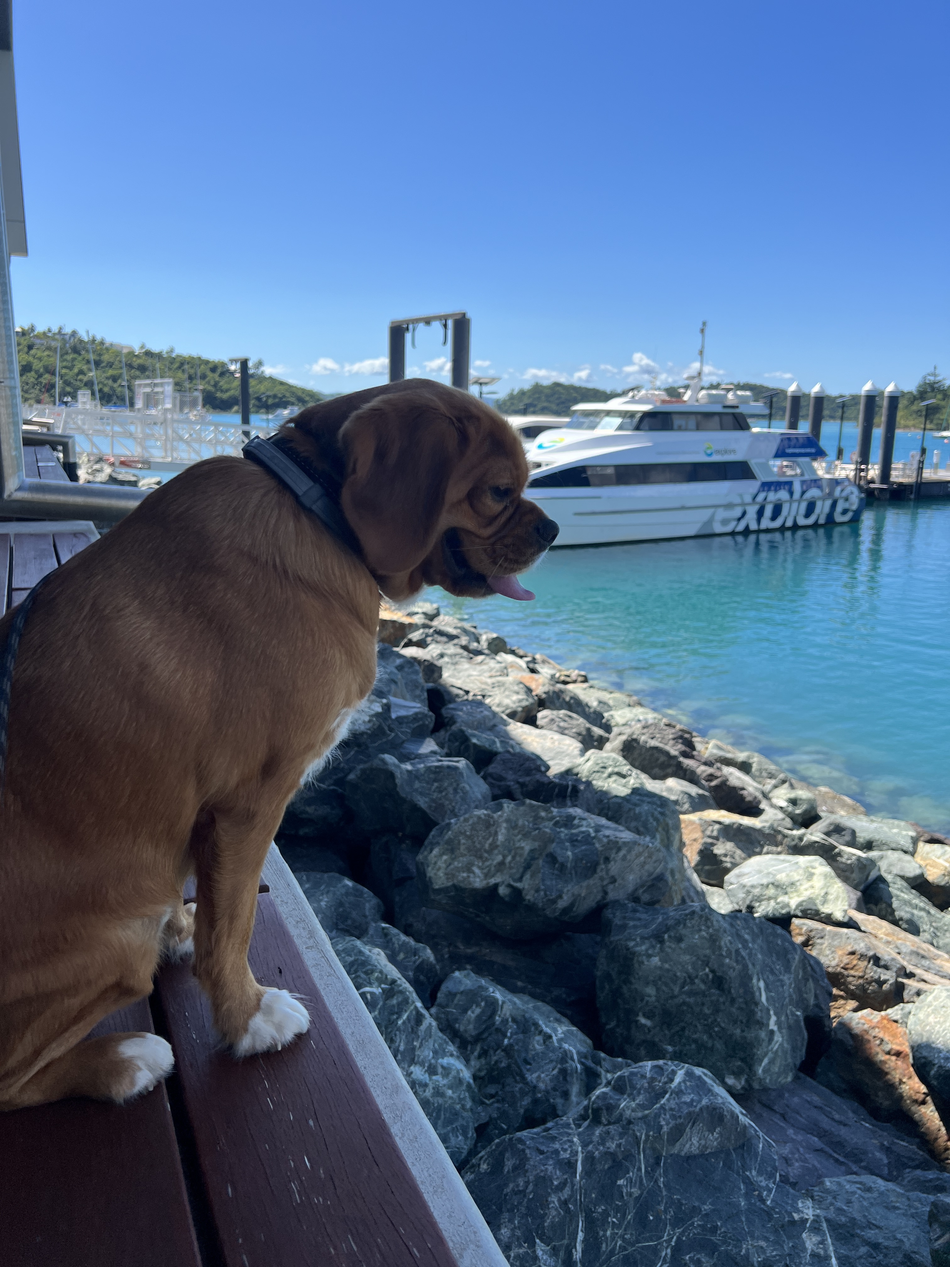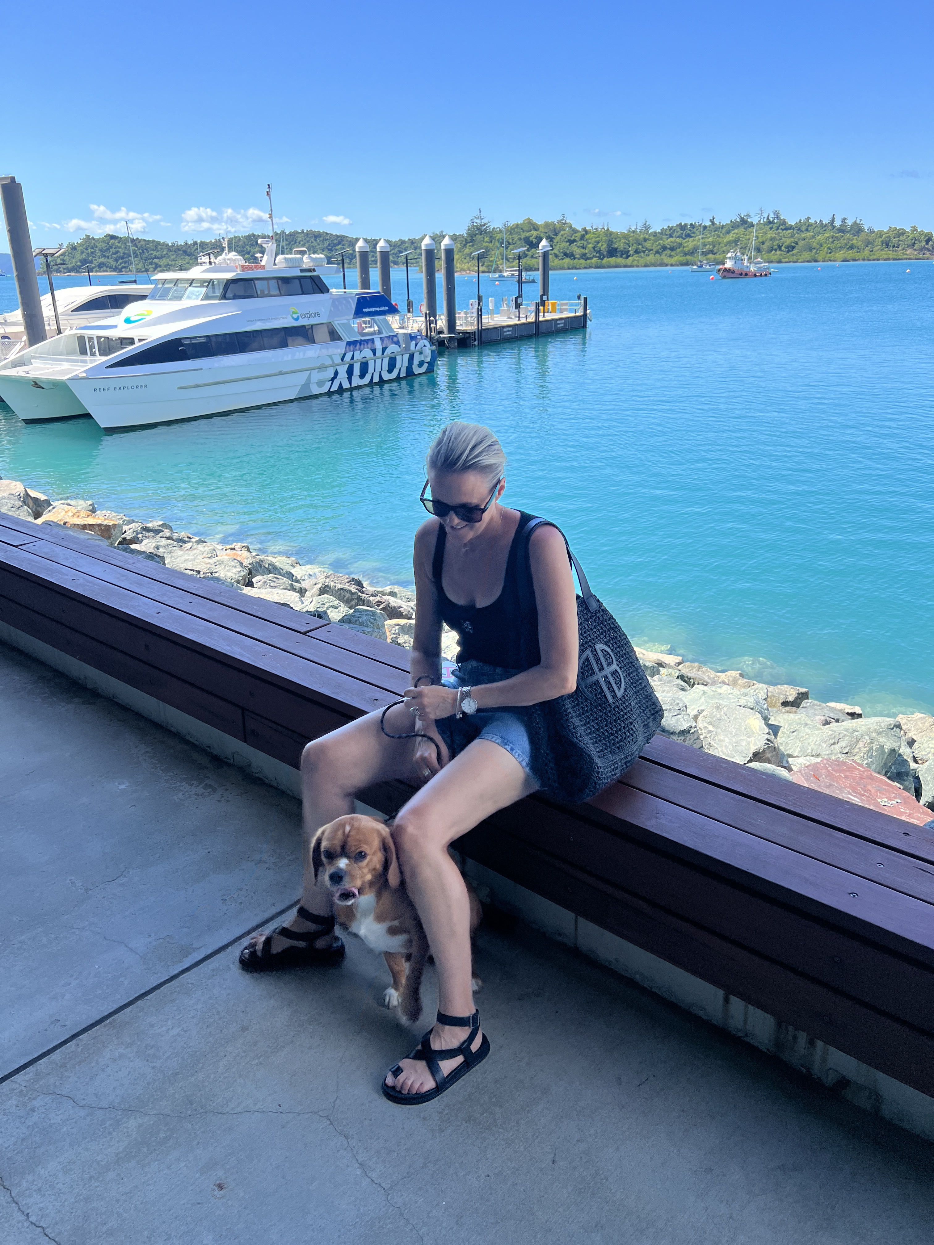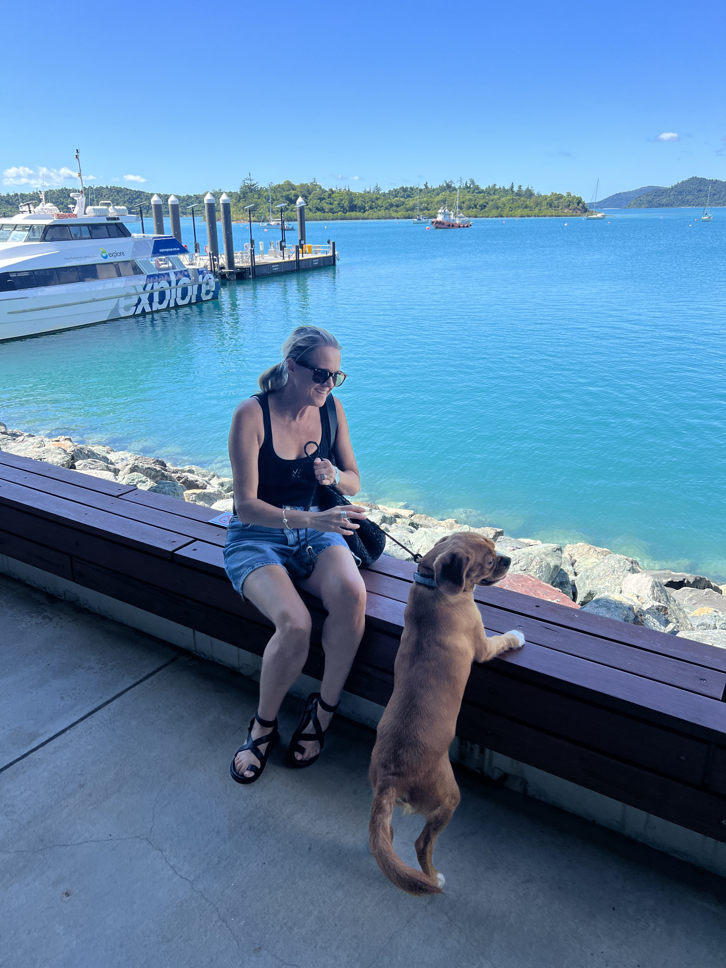 Just like Cairns, Airlie has this magnificent lagoon area that is free and accessible for everyone to use. It has lifeguards on duty and it has walking paths to go through it. Dogs are not allowed, but they are permitted to walk through on the designated path that has paw prints on it. Backing onto the lagoon area are restaurants which give you a lovely view of the lagoon and everyone enjoying themselves. Their lagoon pool is actually over a meter deep in areas so it’s actually great for swimming and the grass area is absolutely huge. It is over 4300 square meters and is full of 4.3 million liters of fresh self chlorinated water. Many restaurants back onto it so it was the perfect place to stop for lunch. The Treehouse was so busy that they apologized for how long the meal was going to take when we arrived, and we were seated at a high table because there were no low tables. It didn’t matter, we had all day, and Henry was happy sitting under the table in a cool area receiving lots of pats from people leaving after their lunch and people walking through the restaurant coming out of the lagoon.