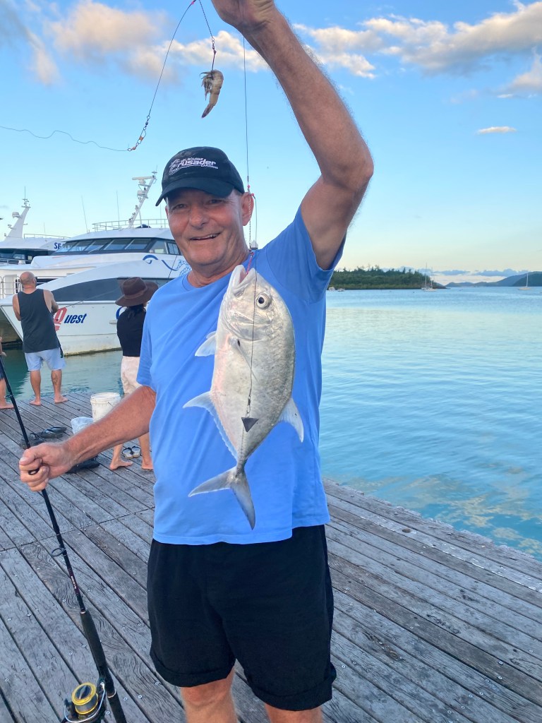 We decided to take a drive to Shute Harbor, which is where all the tour boats leave to go over to the islands. You can access Daydream Island and Hamilton Island from here and, there is a lovely marina and spot to get a bite to eat. It just so happened that there was one of the recommended fishing spots right next to the jetty there. So Ray was keen to check that out. We had a coffee and then made our way back to Airlie Beach where luck would have it, there was a market on. We had learned that if there was a market on the Airlie Beach foreshore, this normally meant that there was a cruise ship in town as well. It was quite a decent market with lots of usual items and the cheapest crystals at a market that I’ve ever seen.