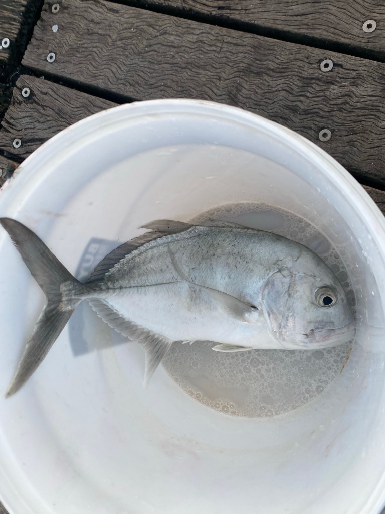 We got back to the van at about three. The day was still very hot although the heat is very different here than Cairns. It’s just hot air and very little humidity. But I wanted to give Henry the chance to cool down and relax in the caravan. So I thought about going to the pool. Ray thought about…going fishing. He desperately wanted to try out one of the local fishing spots. Who was I to put the brakes on a fisherman with a hopeful gleam in his eyes? He put on his fishing gear and off he went. I didn’t hear anything for a while Henry and I napped and snoozed and recovered from our big lunch, and then I got a text. It was Ray beaming, holding a Trevally. I was so happy for him. Finally! The one that got away didn’t get away this time.