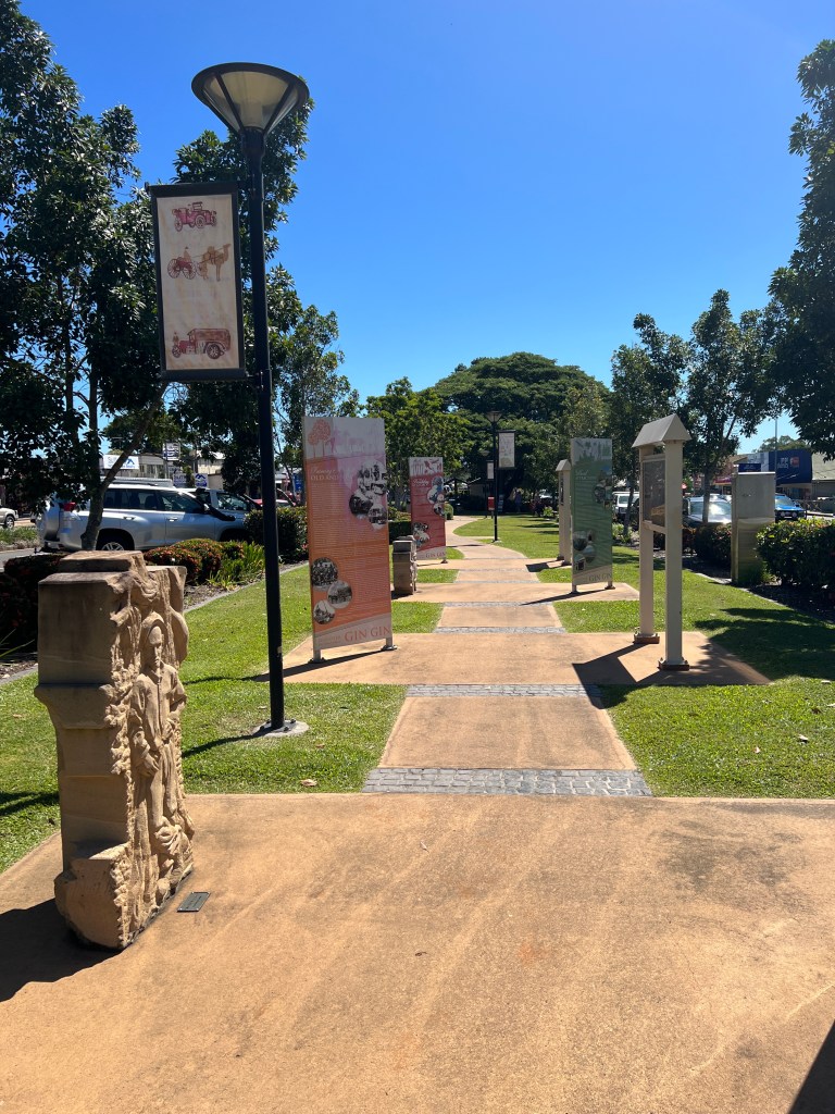 Ray called me back to get the key for the caravan. I wondered what I had forgotten, but then Ray explained that the people he was talking to wanted to have a look through the caravan. Apparently they were in the market for a van and Ray was telling them about how good ours was and offered them a look inside. I’m sure they got the spiel about weights and pulling capacity of the vehicle but I didn’t stop to listen. Henry and I walked through the park to look at the display showing the history of Gin Gin and it was very interesting to see the pioneering history of the town.