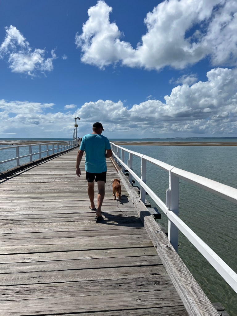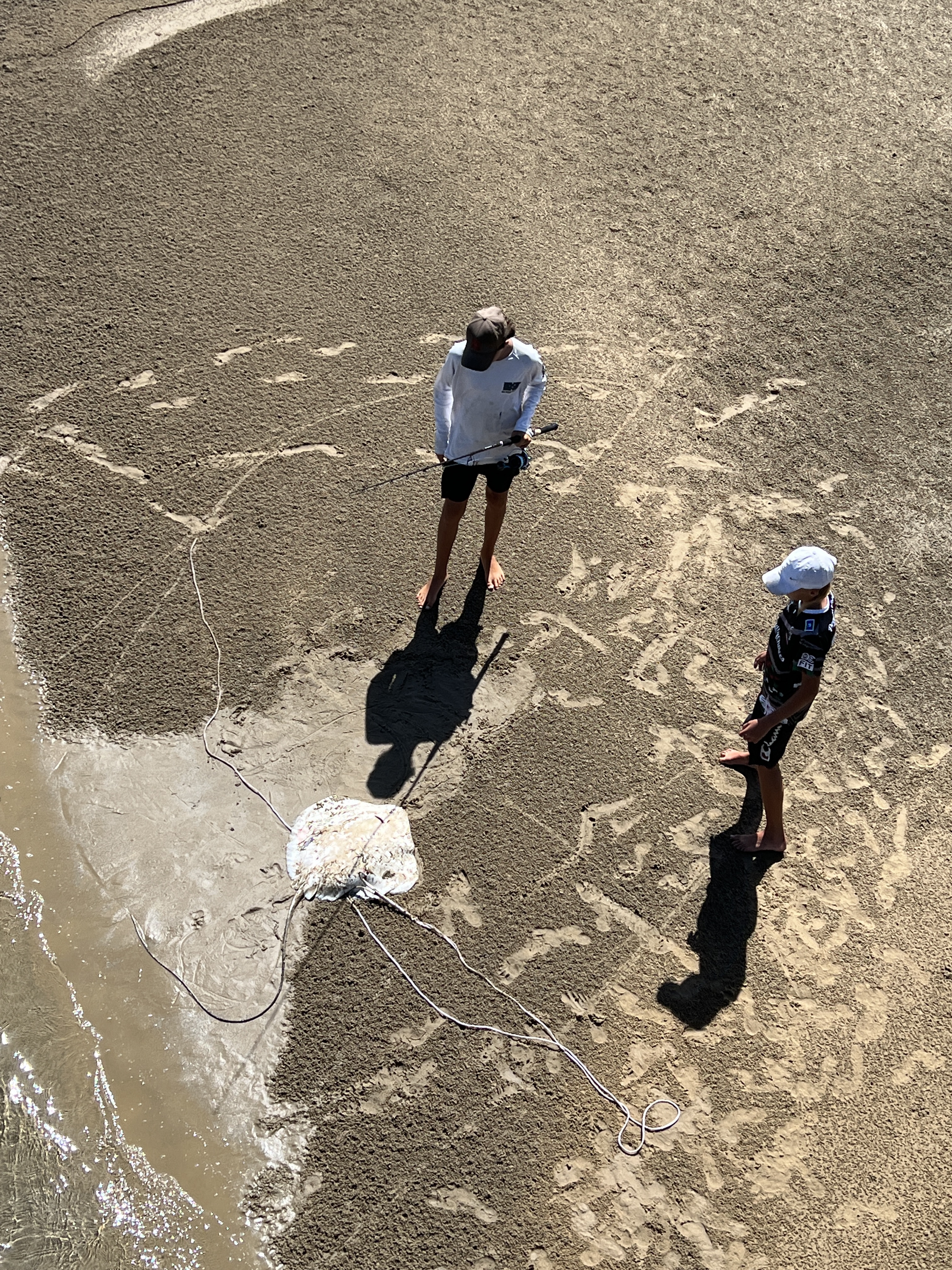 The water was lovely and warm. Perfect for me. We went back to the car and decided to go down to the pier. The pier here is over a kilometer long so that gave us a good 2 km walk. Even though it was about 26° it didn’t feel so hot so we knew Henry would make it OK to the end. We walked along the pier looking at everybody fishing. No one seem to be having much luck. Then we saw some commotion further down the pier. A young guy caught a stingray. He was able to get it out of the water and pull it onto the beach where the tide was out. He then ran down the pier some way, and jumped into the deeper part of the water and managed to take his hook out of it. He said he was going to use it for shark bait. He was pretty impressed with his catch.