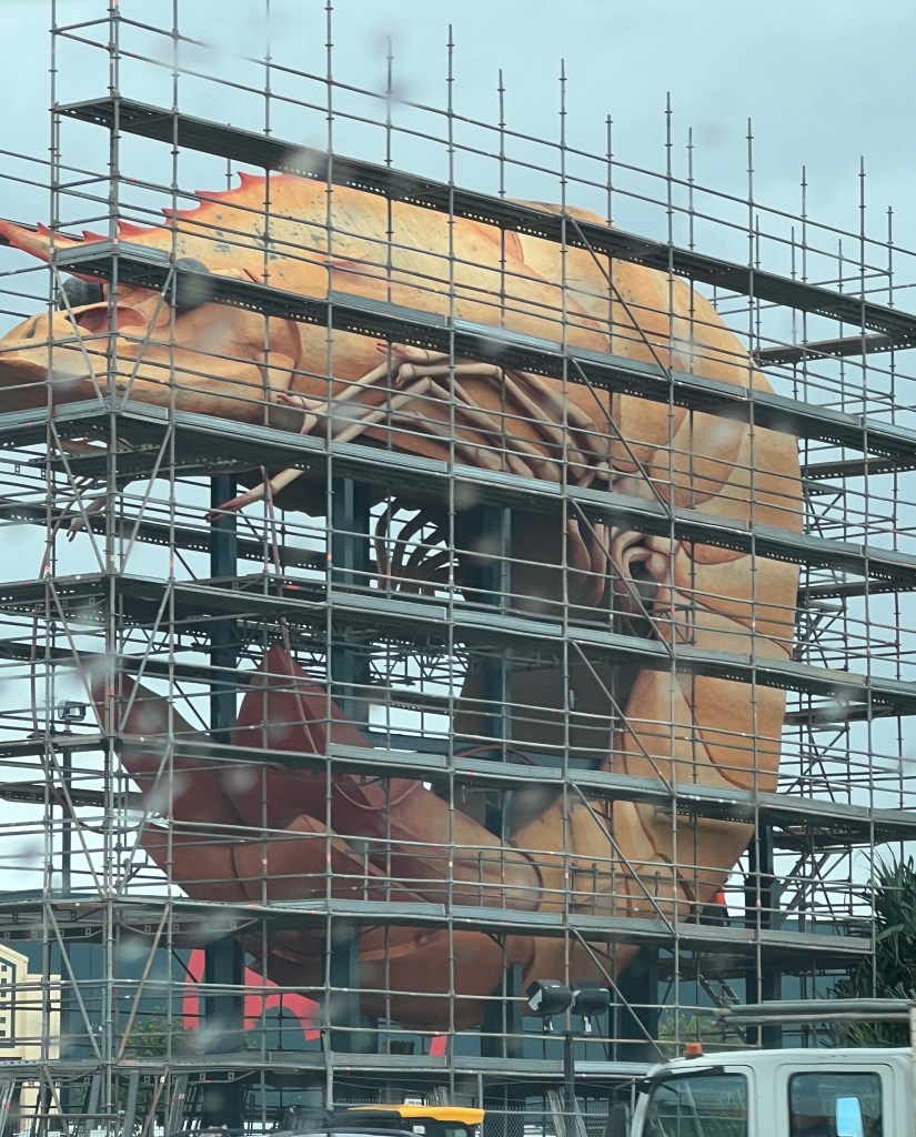 We stopped for morning coffee at Ballina where the Big Prawn was undergoing some restoration works. He had scaffolding all around him and actually looked like he was being peeled ready for eating. The Big Prawn was actually purchased by Bunnings a few years ago and all maintenance is the responsibility of them. Luckily they have the paint and supplies to do all the work!