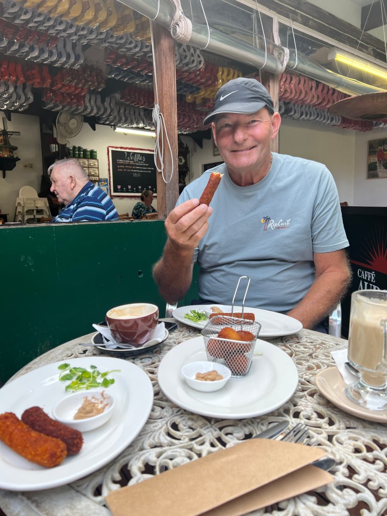 We headed to lunch at Oma’s cafe after trying on the big clogs out the front. This park also has a clog shaped swimming pool and quaint Dutch decorative window sconces. It really was a Dutch flavoured Mecca in so many ways. We had some of the delicacies that the Dutch are known for. Croquettes, Bitternballen and Poffertjes (mini pancakes). Ray was a happy man indeed.