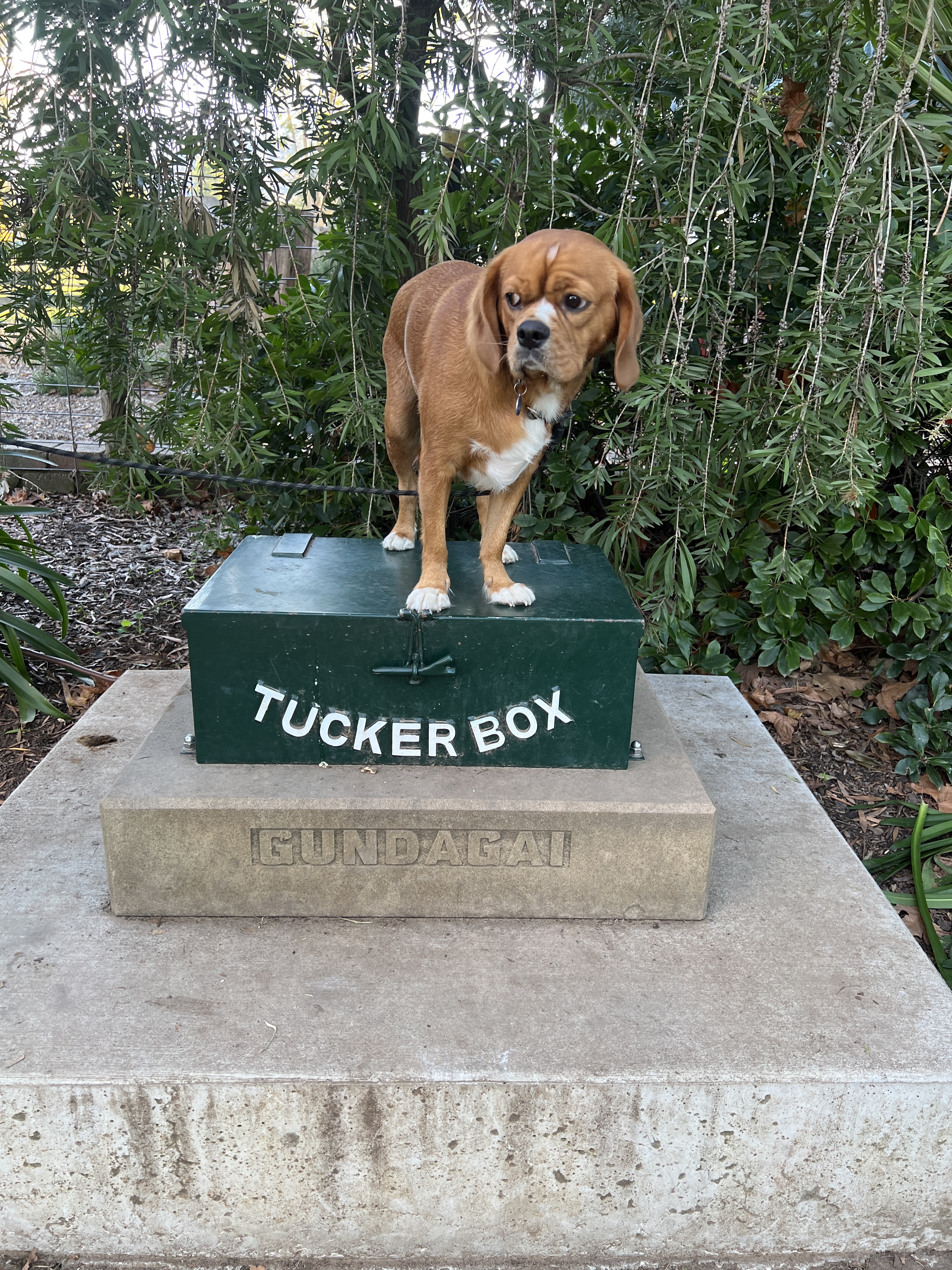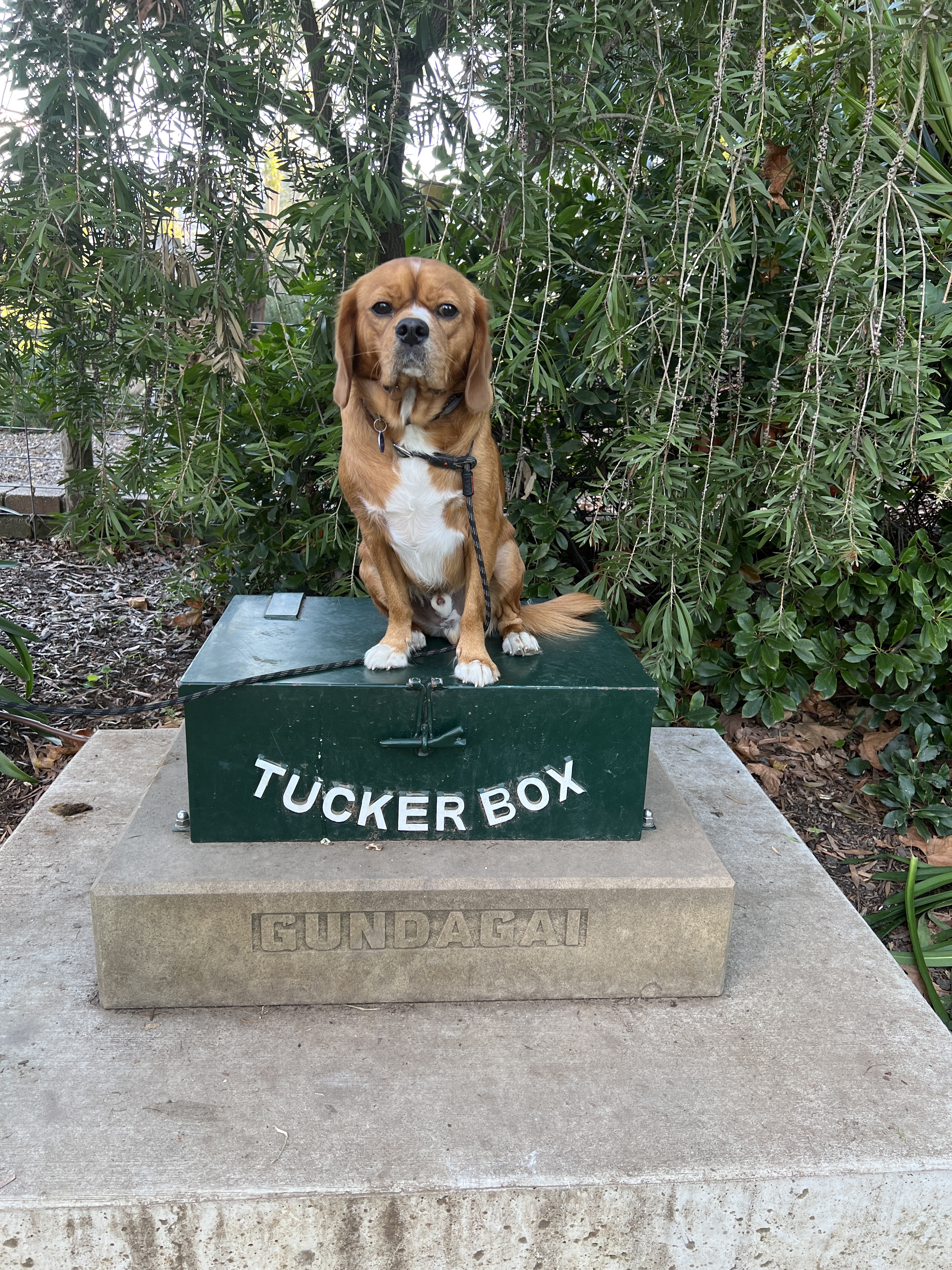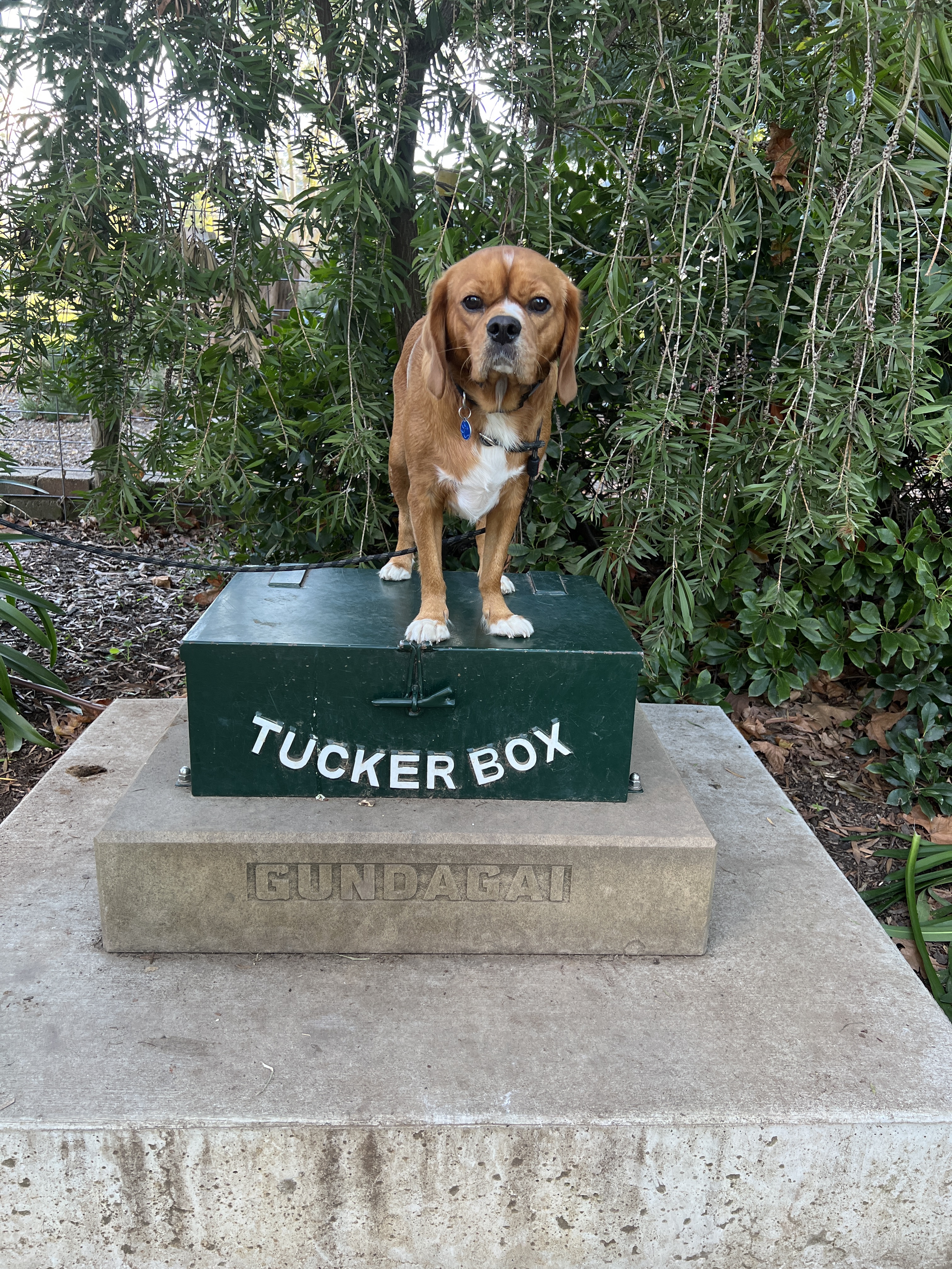 We marveled at the beautiful lights in the tunnels in Sydney, in a 17 km tunnel, it’s nice to have something to look at. We saw the big ram at Goulburn and then stops to put our dog on the Tuckerbox at Gundagai. We’ve never noticed this Tuckerbox just waiting, ready for photo opportunities before. Maybe because we’ve never traveled through Gundagai with a dog before but we thought it was so cute and Henry obliged really well by sitting still for a photo on his own.