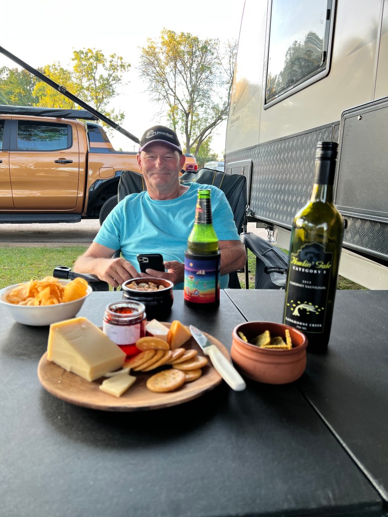 We ventured back to the caravan to start packing up. It seemed like so much hard work though. We had a fiddle around and when the afternoon sun became too tempting, we poured another glass of wine (me) and grabbed a beer (Ray), threw together a cheese platter and enjoyed the last evening of this trip until it got too cold outside.